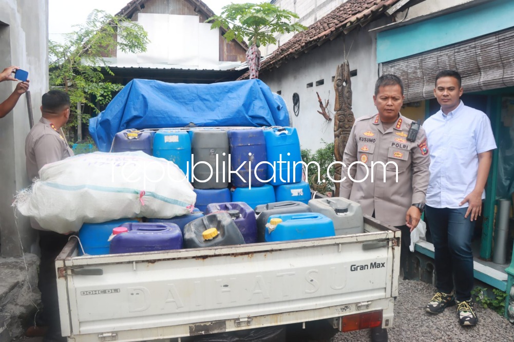 Kapolresta Sidoarjo Kombes Pol Kusumo Wahyu Bintoro saat menggerebek sebuah rumah di Desa Sugihwaras, Kecamatan Candi itu sebelumnya dilaporkan masyarakat dijadikan tempat perdagangan miras. Polisi mendapatkan barang bukti 1.000 liter miras jenis ciu atau arak jowo dengan kadar alkohol 25 persen serta puluhan botol, jerigen dan tutup botol.