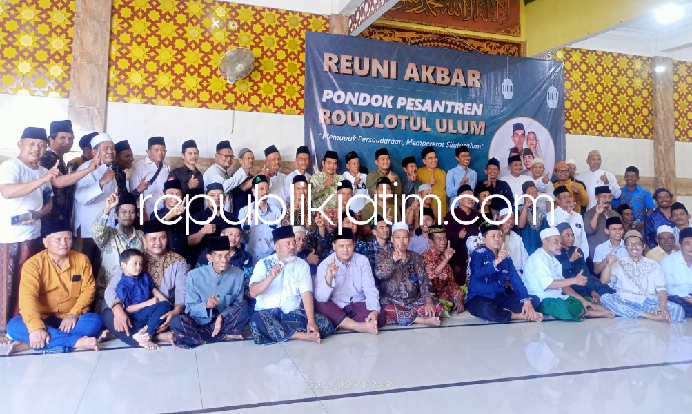 Sidoarjo (republikjatim.com) - Ratusan alumni Pondok Pesantren (Ponpes) Roudlotul Ulum, Dusun Minggir, Desa Larangan, Kecamatan Candi, Sidoarjo menggelar acara Reuni Akbar sekaligus Halal Bi Halal 1444 Hijriyah. Acara ini digelar di aula Ponpes Ponpes Syifaul Qulub, Dusun Banjarpoh, Desa Banjarbendo, Kecamatan Sidoarjo yang diasuh KH Syahidin Ahmad yang merupakan alumni Tahun 90an.