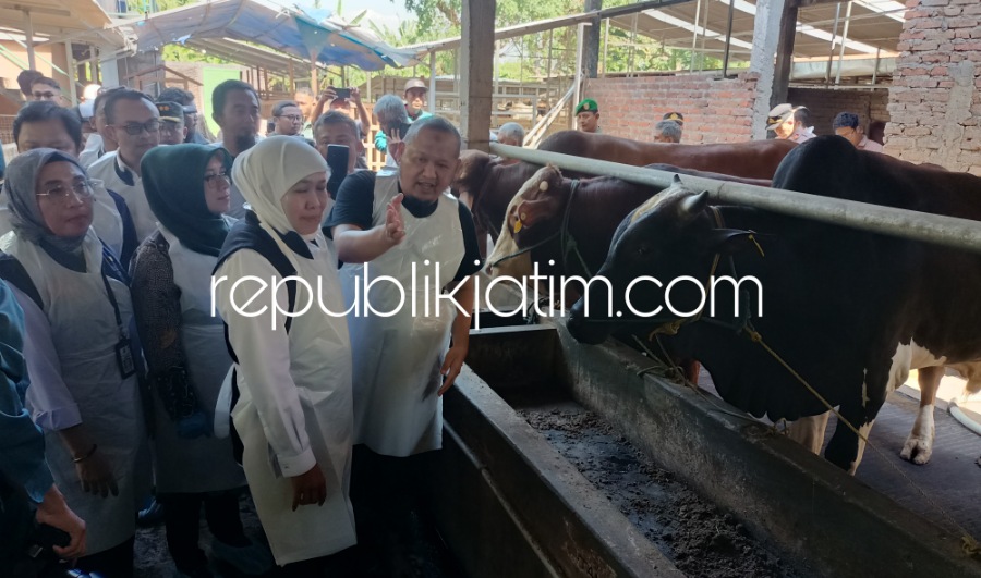 Sidoarjo (republikjatim.com) - Gubernur Jawa Timur (Jatim), Khofifah Indar Parawansa mendatangi peternakan sapi One Qolbu Farm di Perum Taman Wahyu, Desa Sarirogo, Kecamatan Sidoarjo untuk meninjau secara langsung kesiapan hewan Qurban menjelang Idul Adha 1444 Hijriyah.