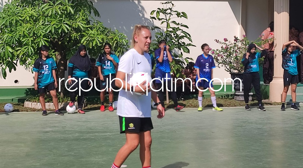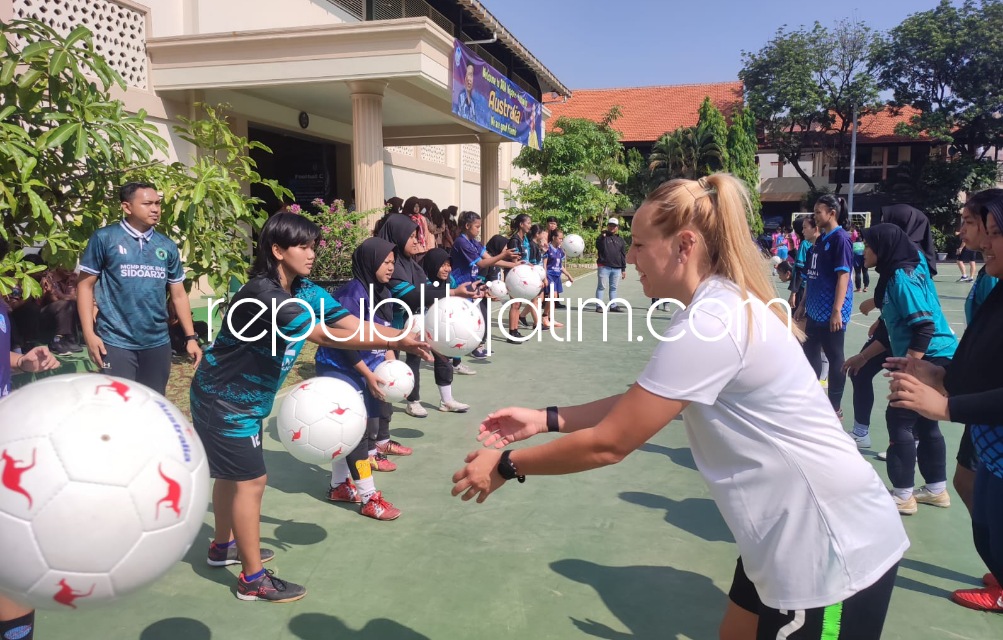 Sidoarjo (republikjatim.com) - Semangat Negara Australia sebagai tuan rumah Piala Dunia sepakbola Wanita Tahun 2023 merambah Indonesia. Ini menyusul, Konjen Australia di Surabaya Viona Hogart mendampingi Gema Simon yang tak lain adalah pemain Timnas Wanita Australia memberikan Coaching Clinic di SMAN 4 Sidoarjo.