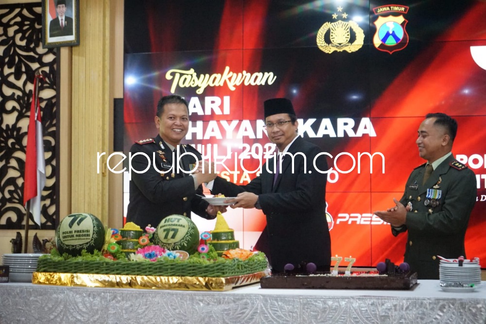Sementara pada momentum ini, Polresta Sidoarjo menyuguhkan penampilan tarian Reog Ponorogo dan Parade Defile seluruh Unit di Polresta Sidoarjo. Acara dilanjutkan memberi penghargaan kepada Bupati Sidoarjo, Wakil Bupati Sidoarjo dan jajaran Forkopimda atas kerjasama dan sinergi dalam menjaga kondusifitas Kabupaten Sidoarjo. Bahkan tercipta suasana aman dan nyaman. Dalam acara Tasyakuran HUT Bhayangkara ke 77 ditandai dengan pemotongan tumpeng oleh Kapolresta Sidoarjo yang diberikan kepada Bupati Sidoarjo. Hel/Waw