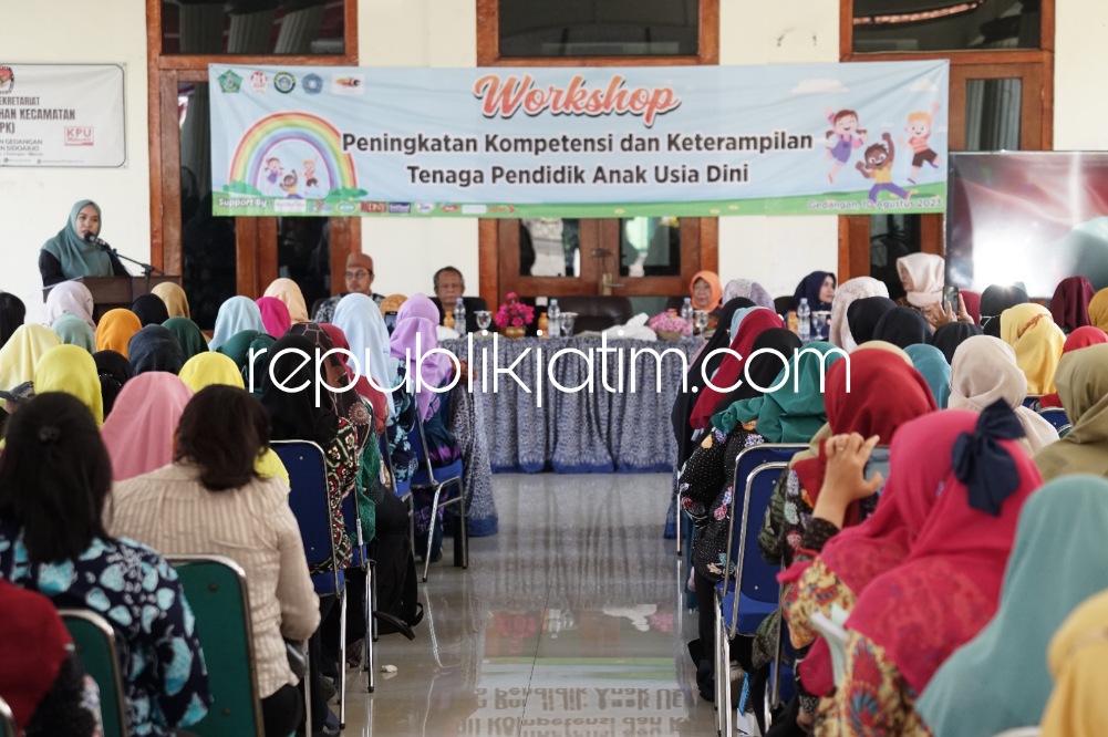 Sidoarjo (republikjatim.com) - Bunda PAUD Kabupaten Sidoarjo, Ny Sa'adah Ahmad Muhdlor membuka acara Workshop Peningkatkan Kompetensi dan Keterampilan Tenaga Pendidik Anak Usia Dini. Workshop yang digelar di Pendopo Kecamatan Gedangan ini diikuti lebih dari 200 bunda PAUD serta 65 lembaga PAUD se Kecamatan Gedangan, Kamis (10/08/2023).
