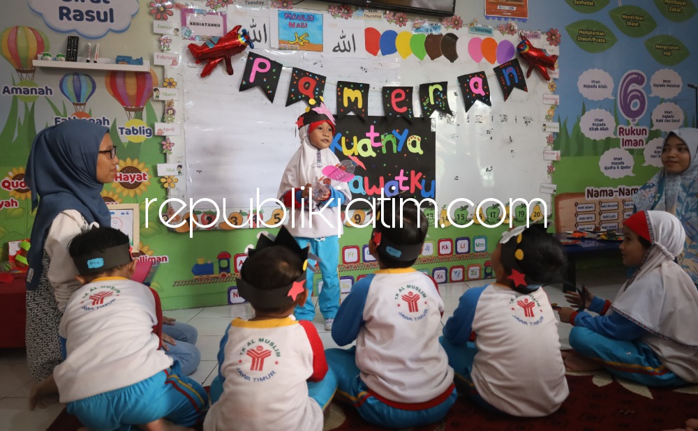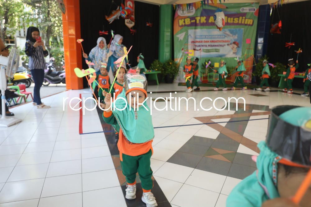 Sidoarjo (republikjatim.com) - Para siswa KB - TK Al Muslim Sidoarjo menggelar Pameran dan Presentasi Hasil Karya, Jumat (27/10/2023). Kegiatan ini, untuk memperingati Hari Penerbangan Nasional sekaligus sebagai puncak Projek Kokurikuler bertema Imajinasi dan Kreativitasku dengan topik Kuatnya Pesawatku.