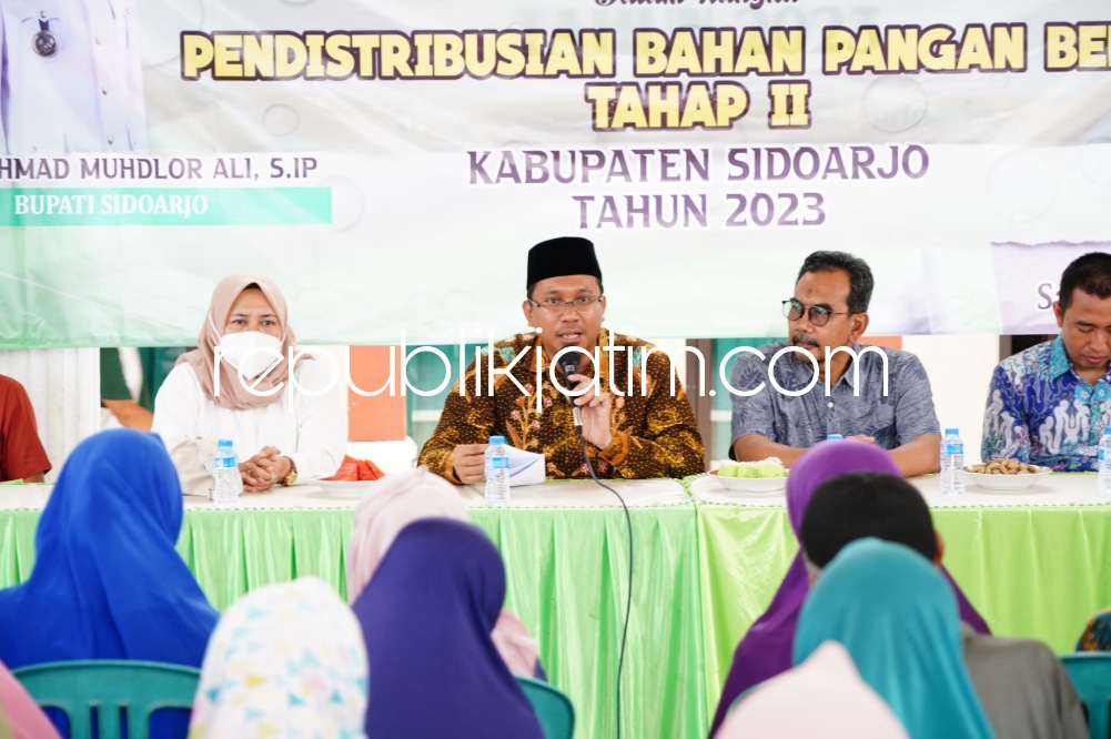 Dalam pendistribusian bahan pangan beras ini, Gus Muhdlor didampingi Kepala Dinas Sosial Pemkab Sidoarjo Ahmad Misbahul Munir, Kepala Dinas Pangan dan Pertanian Kabupaten Sidoarjo Eni Rustianingsih, Camat Krian Ahmad Fauzi, Kepala Desa, Kapolsek dan Danramil Krian. Hel/Waw