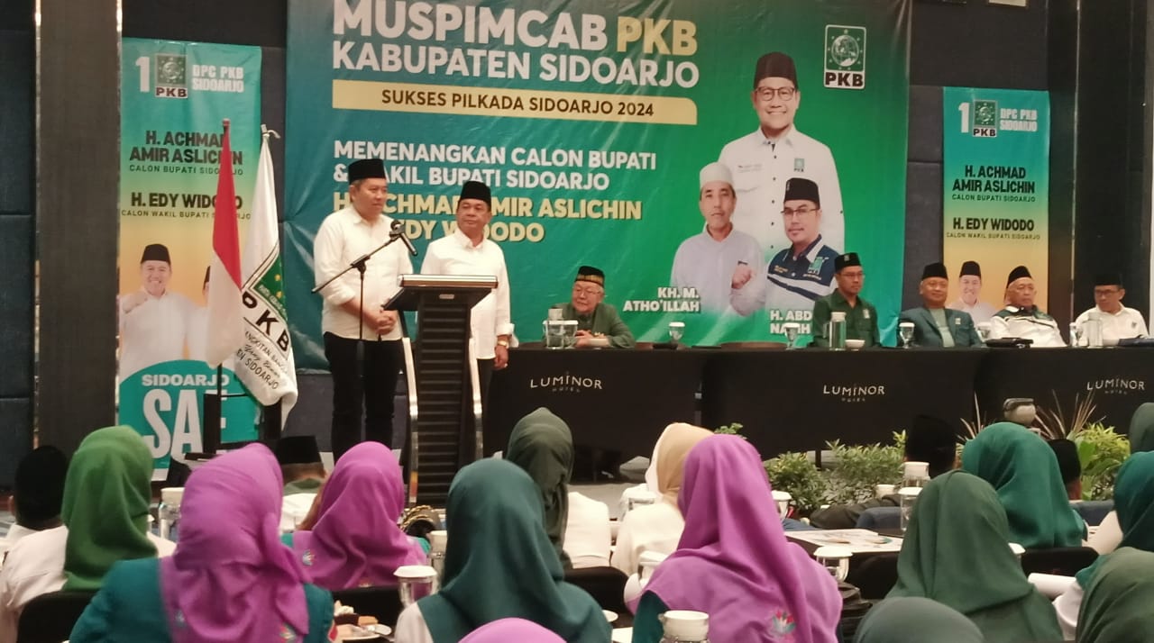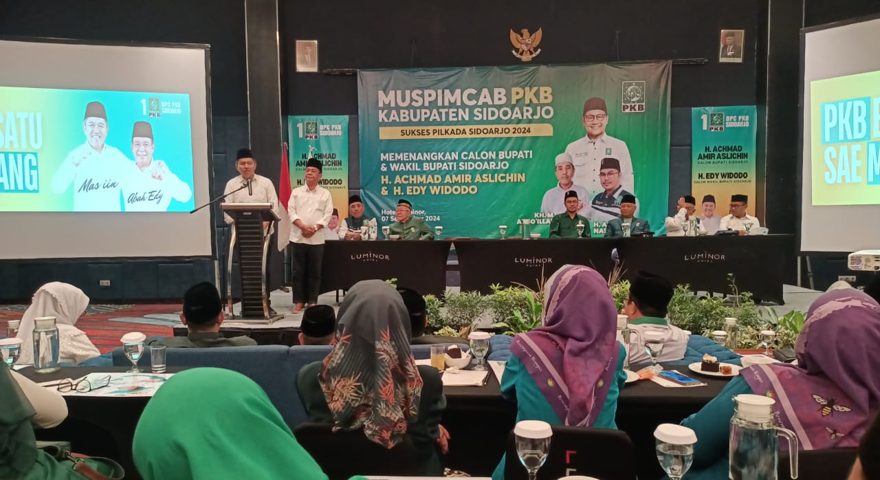 Sidoarjo (republikjatim.com) - Dewan Pengurus Cabang (DPC) PKB Kabupaten Sidoarjo menggelar konsolidasi partai melalui Musyawarah Pimpinan Cabang (Muspimcab) di Hotel Luminor Sidoarjo, Sabtu (07/09/2024) sore. Dalam Muspimcab yang juga menghadirkan seluruh Badan Otonom (Banom) DPC PKB Sidoarjo sepakat untuk memenangkan Pasangan Calon (Paslon) Calon Bupati (Cabup) dan Calon Wakil Bupati (Cawabup), Achmad Amir Aslichin (Mas Iin) dan Edy Widodo (Abah Edy).