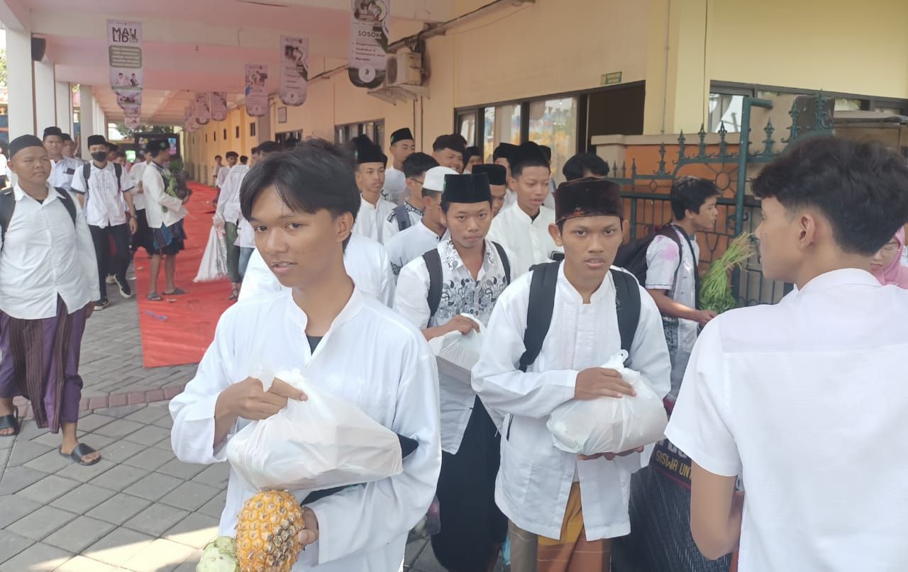 Sidoarjo (republikjatim.com) - Ribuan siswa dan siswi SMK YPM 8 Sidoarjo berebut buah-buahan dan sayuran yang dipajang dalam lima buah hubungan buah dan sayuran di halaman sekolah mereka, Sabtu (06/09/2025). Rebutan buah-buahan dan sayuran itu, merupakan puncak peringatan Maulid Nabi Muhammad SAW 1447 Hijriyah.