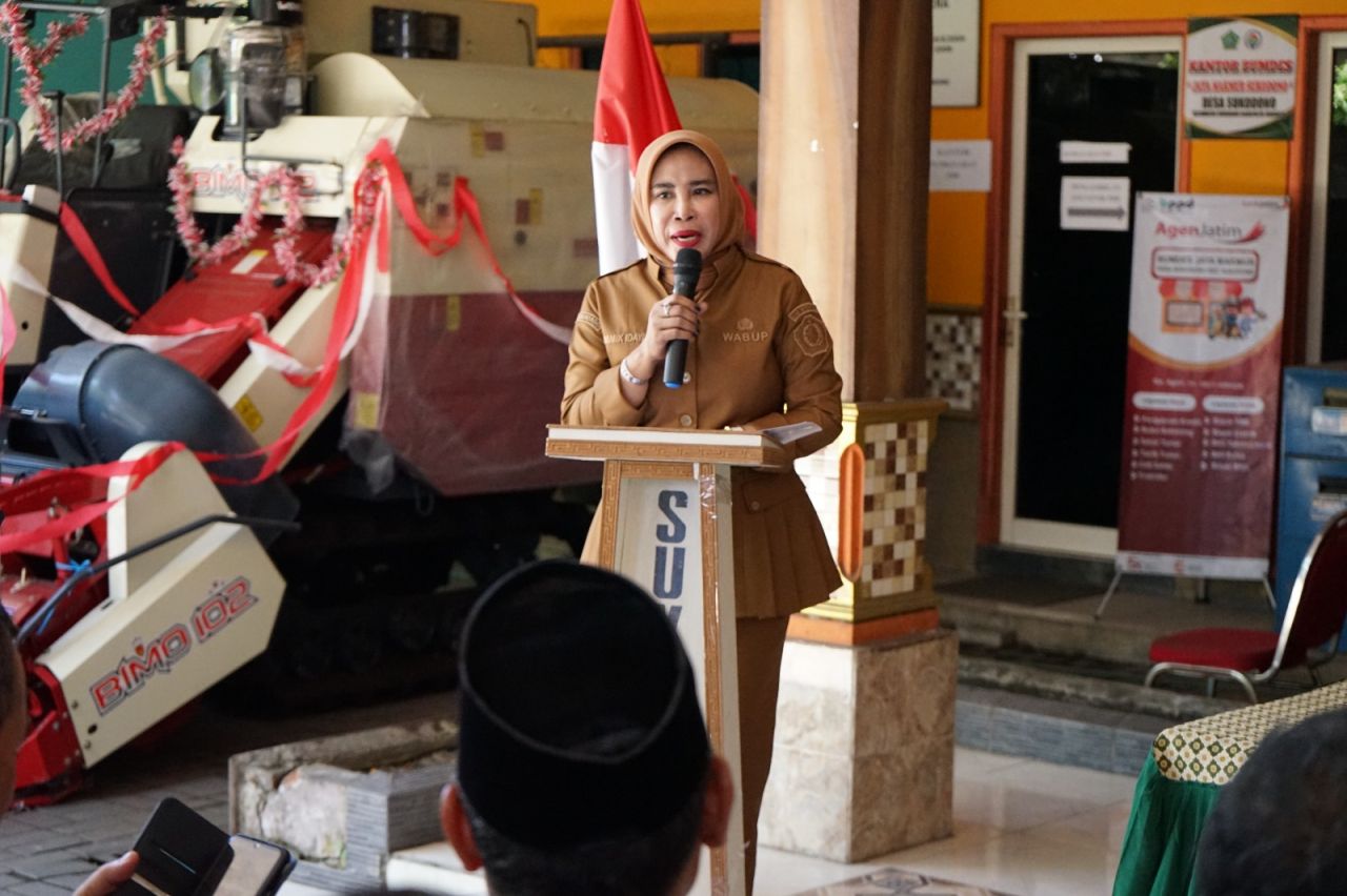 Sidoarjo (republikjatim.com) - Wakil Bupati (Wabup) Sidoarjo, Mimik Idayana menyerahkan bantuan Alat Mesin Pertanian (Alsintan) berupa satu unit Combine Harvester kepada Gabungan Kelompok Tani (Gapoktan) di Desa/Kecamatan Sukodono, Sidoarjo. Penyerahan bantuan itu diserahkan Mimik Idayana secara berlangsung di kantor balai desa setempat didampingi perwakilan Dinas Pangan dan Pertanian Pemkab Sidoarjo, Senin (13/10/2025).
