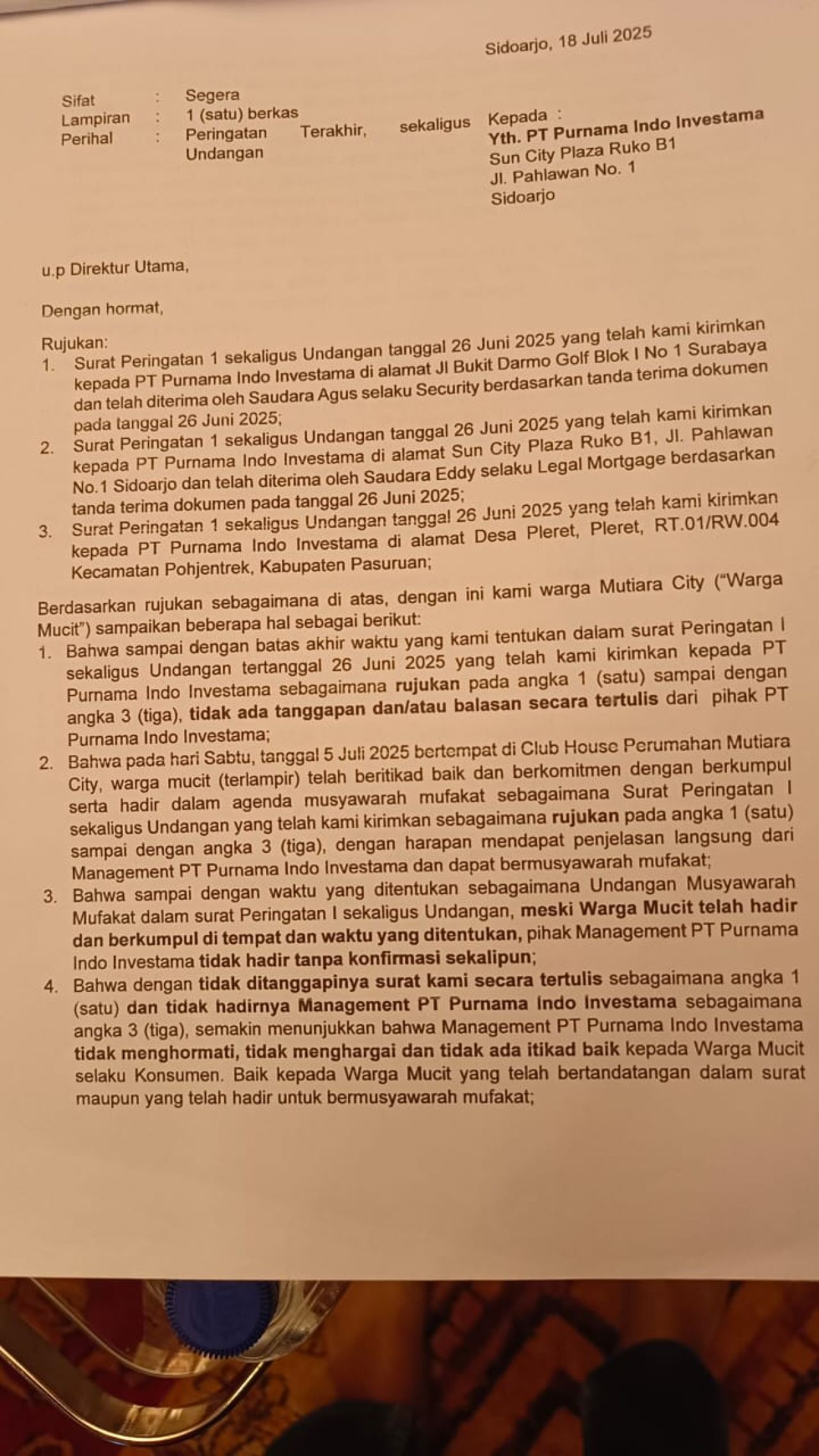 "Kami sudah menyampaikan somasi 1 ke pengembang soal itu tanggal 26 Juni Tahun 2025 kemarin. Tapi, somasi pertama itu tidak direspon. Selanjutnya, kami sampaikan lagi somasi tertanggal 18 Juli Tahun 2025 juga tidak direspon oleh pengembang. Karena itu, kami akan kirimkan somasi ketiga ke pengembang PT Purnama Indo Investama lagi. Kalau somasi kita tidak diwujudkan integrasi jalan menuju Perumahan Mutiara City ke Mutiara Perumahan Mutiara Regency. Bahkan, kami juga akan tempuh langkah hukum lainnya sesuai peraturan dan perundang-undangan yang ada," tegasnya.