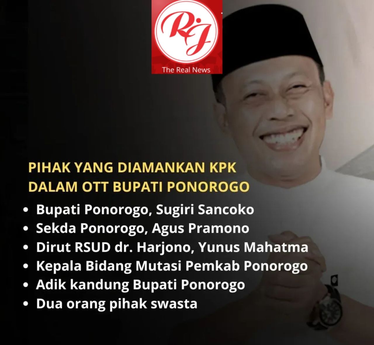 Kasus OTT terhadap Bupati Ponorogo Sugiri Sancoko diduga berkaitan dengan praktik mutasi dan promosi jabatan di lingkungan Pemkab Ponorogo.