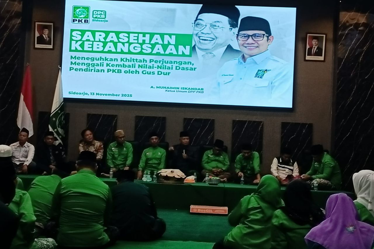 Sidoarjo (republikjatim.com) - Dewan Pimpinan Cabang (DPC) Partai Kebangkitan Bangsa (PKB) Kabupaten Sidoarjo menggelar acara Tasyakuran Atas Penganugerahan Gelar Pahlawan Nasional Tahun 2025. Kegiatan penghormatan sekaligus untuk menanamkan nilai-nilai perjuangan yang dilaksanakan ketiga pahlawan asal Jatim itu, digelar di Kantor DPC PKB Sidoarjo, Kamis (13/11/2025) malam.
