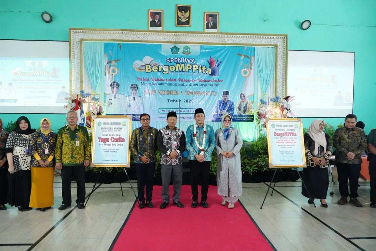 Sidoarjo (republikjatim.com) - Aula dan halaman SMP Negeri 1 Wonoayu dipenuhi semangat kreasi, Kamis (20/11/2025) pagi. Saat itu, sekolah ini meluncurkan dua program literasi inovatif: BergeMPPita (Bergerak Menulis Pantun, Puisi dan Cerita) dan Tugu Cerita (Satu Minggu Satu Cerita).