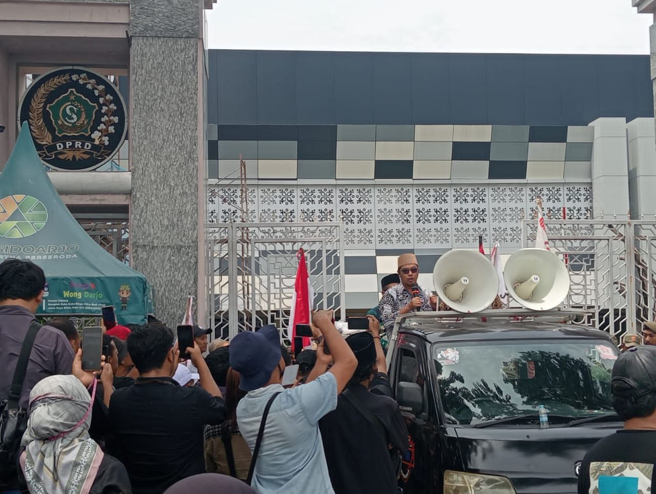 Dalam aksi itu, mereka mulai dari orasi di depan Kejaksaan Negeri (Kejari) Sidoarjo. Massa langsung orasi di depan kantor Kejari Sidoarjo. Usai orasi secara bergantian dengan menghujat kinerja tim penyidik Kejari Sidoarjo, massa kemudian bergeser ke kantor Pemkab Sidoarjo. Di Kantor Pemkab Sidoarjo massa juga bergantian orasi dengan fokus menghujat 14 program Bupati dan Wakil Bupati (Wabup) Sidoarjo yang dinilai gagal merealisasikan janji politik saat kampanye Tahun 2024 kemarin.