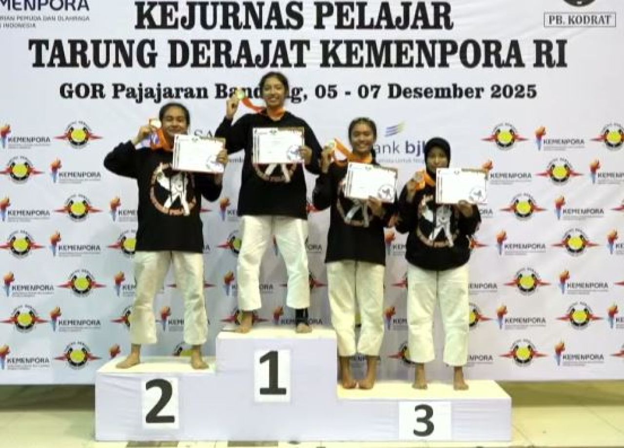 Sidoarjo (republikjatim.com) - Sebanyak empat atlet Keluarga Olahraga Tarung Derajat (Kodrat) Sidoarjo berhasil membawa pulang medali usai Kejurnas Pelajar Tarung Derajat Kemenpora RI 2025 di Bandung kemarin. Atlet pelajar Tarung Derajat Sidoarjo itu, berhasil menggondol medali emas, perak dan perunggu.