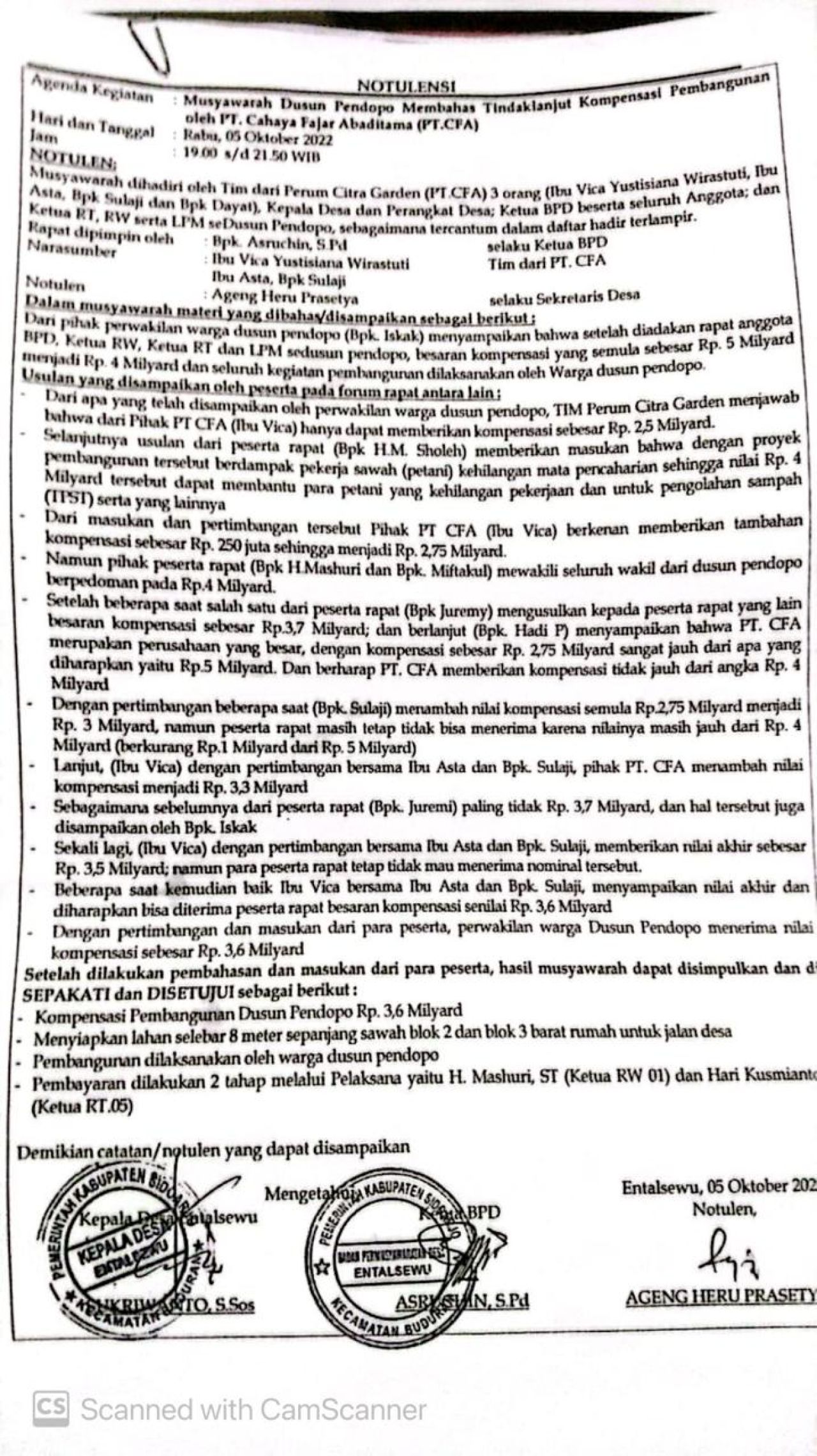 Kasus dugaan korupsi dalam perkara ini, tim penyidik Pidsus Kejari Sidoarjo menilai dana bantuan dari pihak ketiga PT Cahaya Fajar Abaditama (pengembang proyek perumahan elit Citra Garden) senilai Rp 3,6 miliar di Tahun 2022 kemarin. Namun, oleh Pemerintah Desa (Pemdes) Entalsewu uang kompensasi bernilai miliaran itu, tidak dimasukkan ke dalam APBDes Emtalsewu, Kecamatan Buduran, Sidoarjo.
