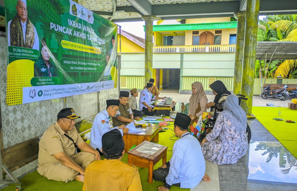 Sidoarjo (republikjatim.com) - Menutup akhir Tahun 2025 dengan langkah penuh berkah, Lembaga Wakaf dan Pertanahan (LWP) MWC NU Prambon menggelar prosesi Ikrar Wakaf massal untuk 9 rumah ibadah. Acara yang berlangsung khidmat itu, dipusatkan di Masjid Al Mujahadah, Desa Bulang, Kecamatan Prambon yang dikenal sebagai masjid tertua di wilayah Kecamatan Prambon.