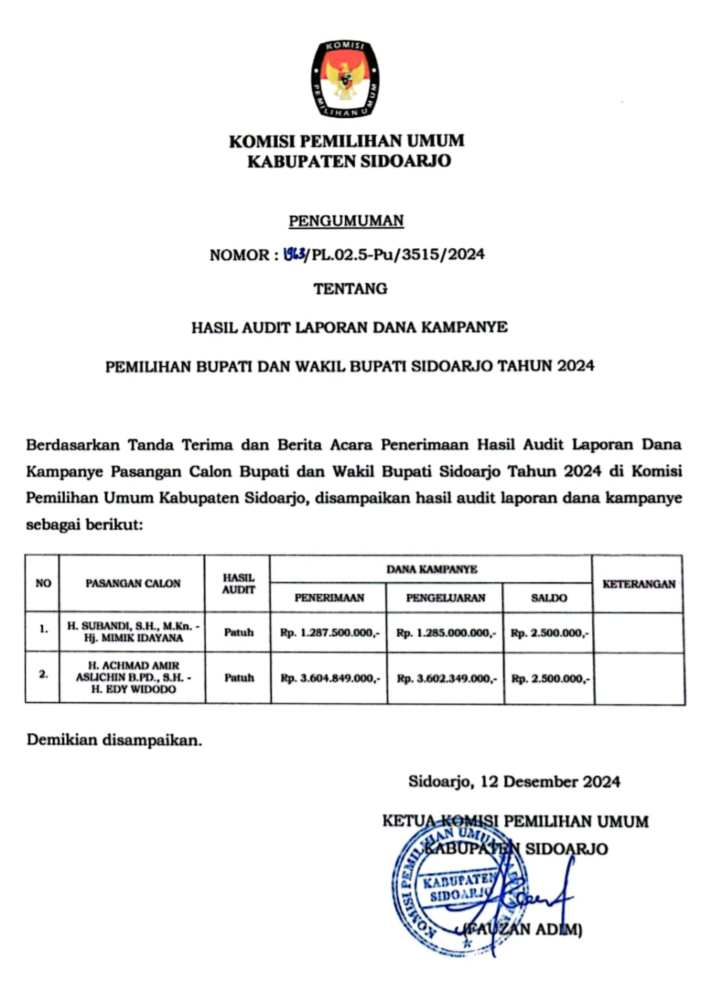 Sedangkan soal dana kampanye sebesar Rp 28 miliar yang sempat mencuat, Fauzan menyatakan data yang masuk dan diumumkan secara resmi oleh KPU Sidoarjo jauh di bawah angka itu. Termasuk dana sumbangan pihak lain besarnya tidak ada yang mencapai Rp 28 miliar.