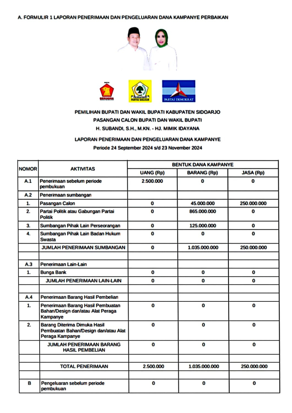 "Yang dilaporkan resmi tim Paslon Subandi - Mimik Idayana (BAIK) hanya senilai Rp 1,287 miliar. Kalau ada pengakuan dana kampanye sampai Rp 28 miliar, itu jelas tidak dilaporkan e ada resmi kepada penyelenggara (KPU). Karena kita (KPU) tidak mengelola anggaran (dana) kampanye. Dana itu dikelolah tim BAIK sendiri. Kami hanya terima data administrasi saja," ujar Fauzan Adhim kepada republikjatim.com, Jumat (23/01/2026).