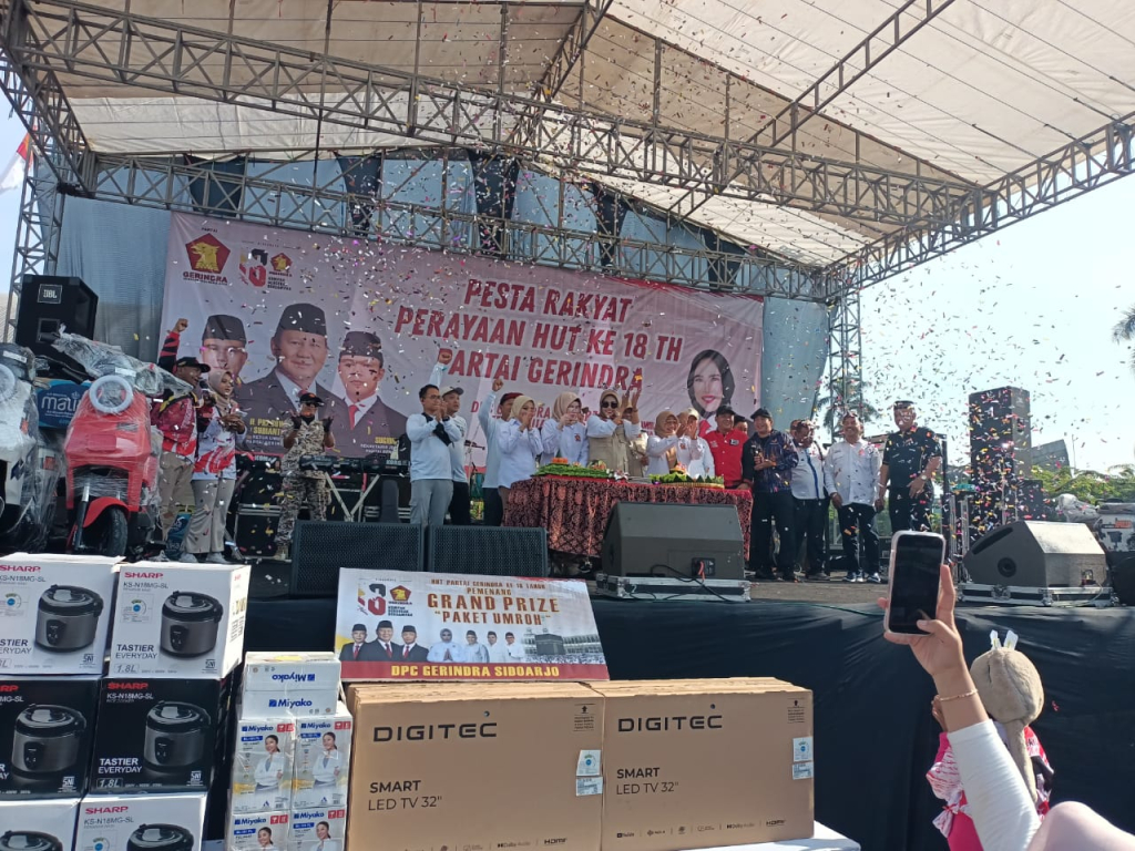 Sidoarjo (republikjatim.com) - Kemeriahan pesta rakyat dalam rangka HUT ke-18 DPC Partai Gerindra Sidoarjo diwarnai momen haru dan emosional di dekat panggung utama yang ada di Halaman Parkir Timur GOR Sidoarjo, Minggu (15/02/2026).