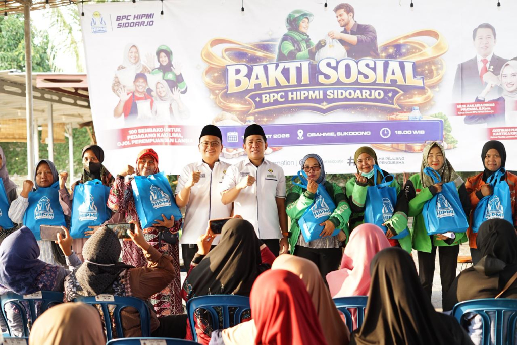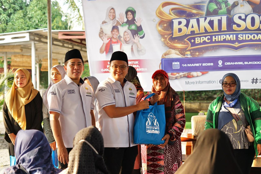 BERBAGI - Badan Pengurus Cabang Himpunan Pengusaha Muda Indonesia (BPC HIPMI) Sidoarjo menunjukkan kepedulian sosial melalui bakti sosial dengan membagikan 100 paket sembako gratis kepada warga yang membutuhkan, Jumat (13/03/2026) sore.