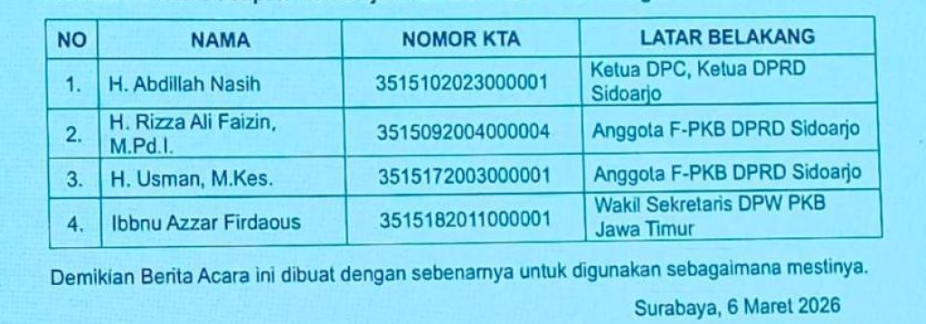 Sementara hasil Muscab PKB Sidoarjo menghasilkan empat nama yang diusulkan ke DPP PKB. Keempat Bakal Calon itu diantaranya H Abdillah Nasih (Ketua DPRD Sidoarjo), H Rizza Ali Faizin (Ketua Komisi A DPRD Sidoarjo), H Usman M Kes (Ketua DPRD periode 2019-2024) dan Ibnu Azzar Firdaus (pengurus DPW PKB Jatim). Keempat kader loyalis dan tegak lurus itu muncul sebagai calon yang menguat.