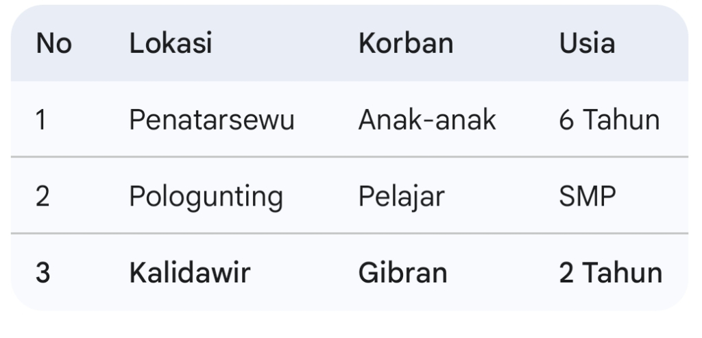 Sedangkan ​catatan merah dan rentetan kejadian serupa, yakni tragedi yang menimpa Gibran menambah daftar panjang kasus anak tenggelam di wilayah Sidoarjo dalam waktu yang berdekatan. Berdasarkan data lapangan, ini merupakan kejadian ketiga dalam periode terakhir: