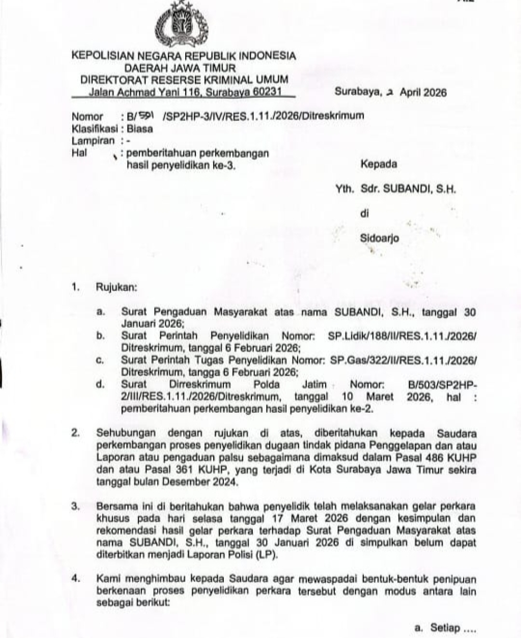 Keputusan itu, tertuang dalam Surat Pemberitahuan Perkembangan Hasil Penyelidikan (SP2HP) ke 3 tertanggal 2 April 2026. Berdasarkan hasil gelar perkara khusus, penyidik menyimpulkan pengaduan Subandi tidak memenuhi unsur pidana untuk ditingkatkan menjadi Laporan Polisi (LP).