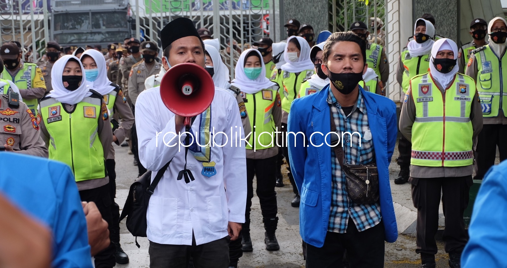 Sidoarjo (republikjatim.com) - Puluhan aktivis Pergerakan Mahasiswa Islam Indonesia (PMII) Cabang Sidoarjo menggelar demo penolakan UU Cipta Kerja (Omnibus Law) di halaman Kantor Dewan Perwakilan Rakyat Daerah (DPRD) Sidoarjo, Kamis (15/10/2020) sore.