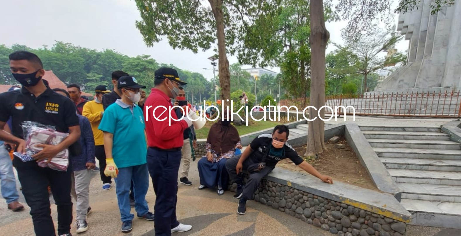 Dengan berbekal pengeras suara, Pj Bupati Sidoarjo keliling Alun-Alun dengan membawa masker. Setiap pengunjung yang ikut membersihkan sampah diberikan masker gratis. Hasilnya, ribuan masker dibagikan ke masyarakat. Selain menjaga kebersihan, Hudiyono mengajak pengunjung Alun-Alun disiplin menjaga protokol kesehatan. Sebagian anak-anak kedapatan tidak memakai masker langsung diberi masker dan diedukasi.