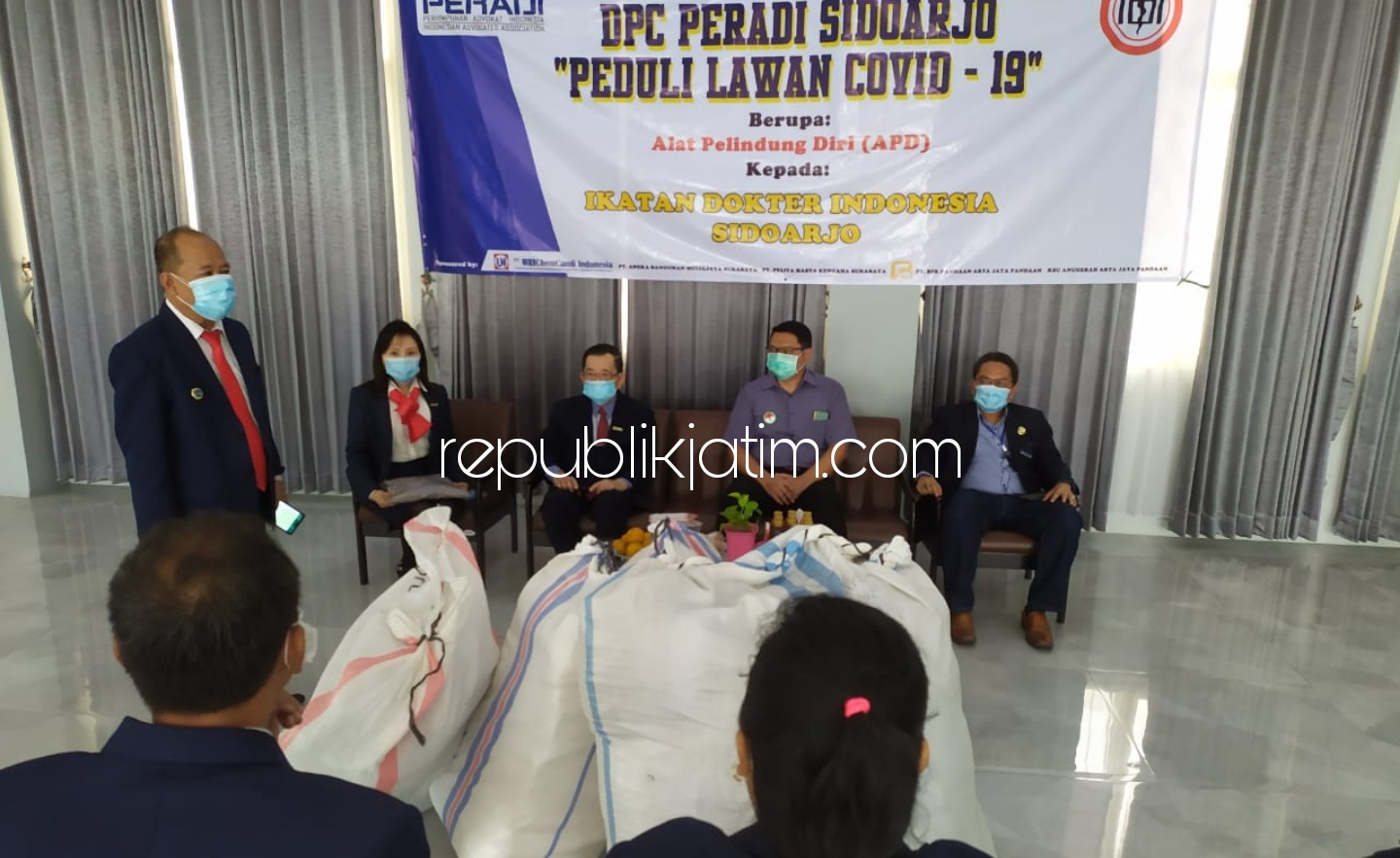 Sidoarjo (republikjatim.com) - Dewan Pimpinan Cabang Perhimpunan Advokat Indonesia (DPC Peradi) Sidoarjo menyalurkan 300 unit Alat Pelindung Diri (APD) kepada pengurus Ikatan Dokter Indonesia (IDI) Cabang Sidoarjo di Sekretariat Graha IDI, Jl Cendekia Sidowayah, Kecamatan Sidoarjo, Kamis (22/10/2020). Penyerahan bantuan itu, sebagai bentuk kepedulian Peradi Sidoarjo terhadap para tenaga medis yang berada di garda depan dalam penanganan Covid-19.