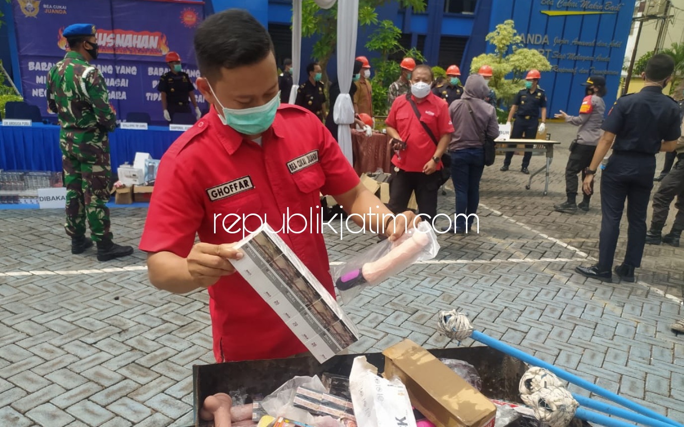 Seluruh barang sitaan itu, dimusnahkan Direktorat Jenderal Bea dan Cukai (DJBC) Jatim I KPPBC Tipe Madya Pabean Juanda, Selasa (27/10/2020). Proses pemusnahannya dilakukan dengan berbagai cara seperti dibakar, dilebur, dipecah dan dipotong-potong.