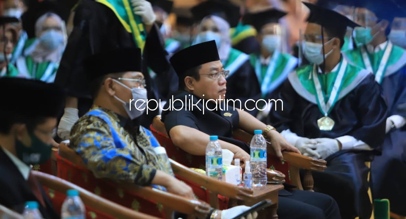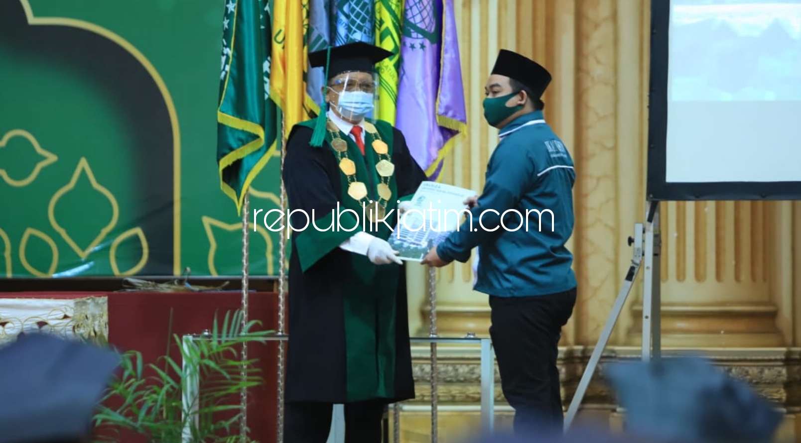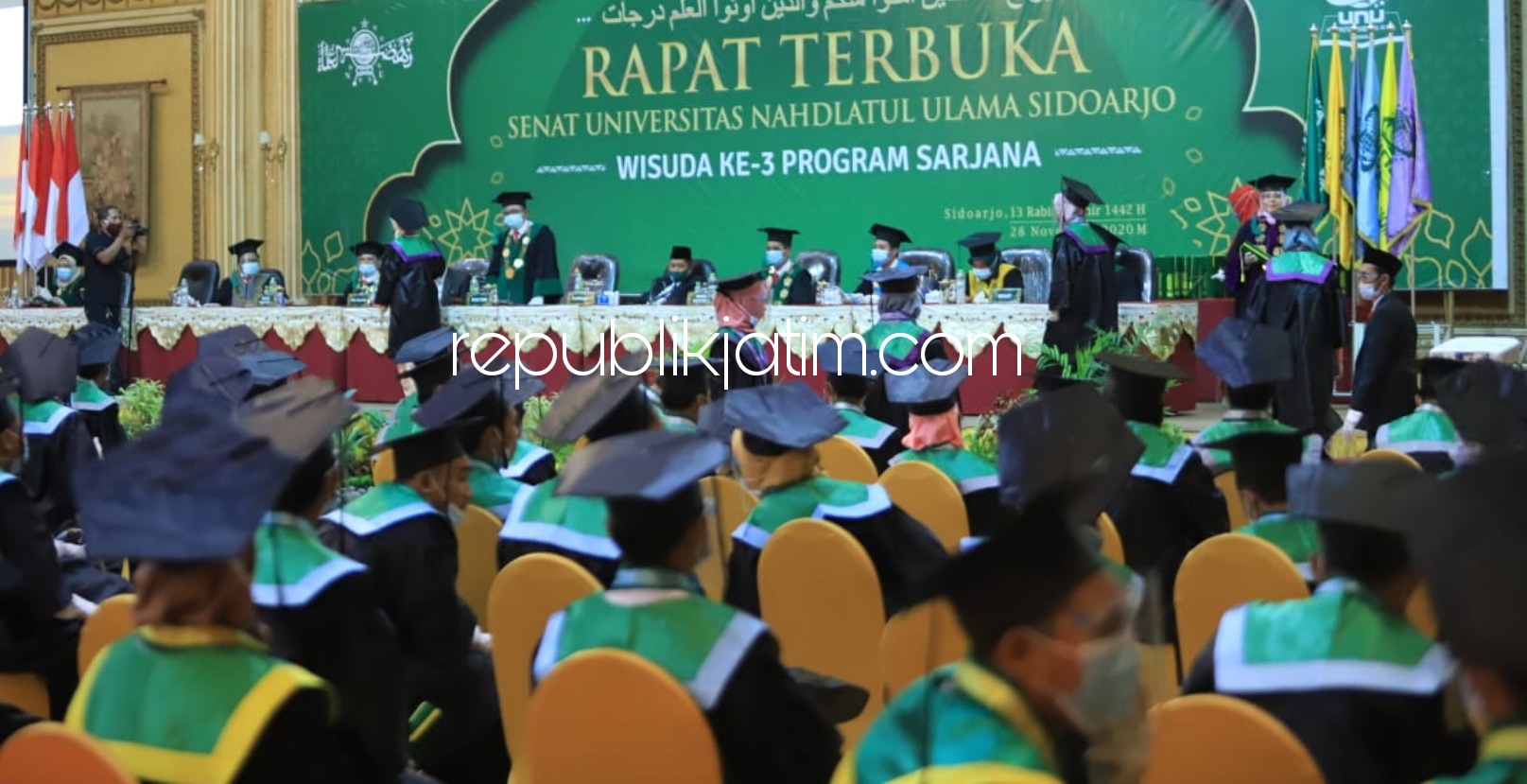 Sidoarjo (republikjatim.com) - Sebanyak 230 sarjana mengikuti prosesi wisuda yang ketiga yang digelar Universitas Nahdlatul Ulama Sidoarjo (Unusida) di Aula Madinah Hotel Utami Juanda, Sidoarjo, Sabtu (28/11/2020). Dalam prosesi wisuda ini, menerapkan protokol kesehatan (Prokes) secara ketat. Selain menjaga jarak, semua peserta menggunakan face shield, serta mencuci tangan dan dicek suhu badannya.