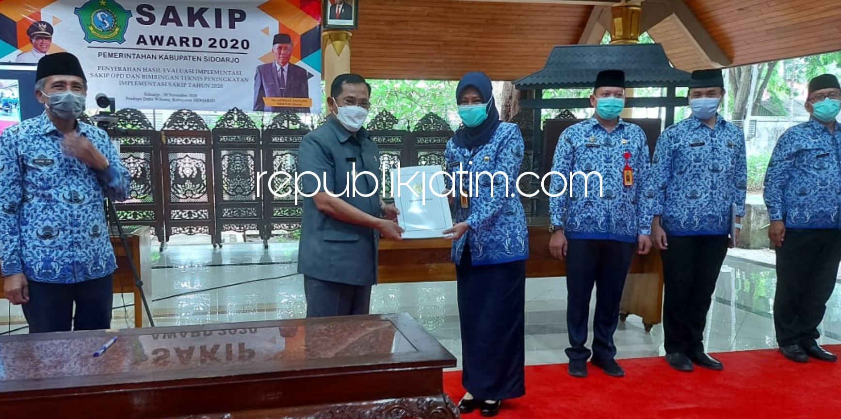 Sidoarjo (republikjatim.com) - Tim evaluasi Sistem Akuntabilitas Kinerja Instansi Pemerintahan (SAKIP) Pemkab Sidoarjo menyerahkan hasil evaluasi kepada Organisasi Perangkat Daerah (OPD) Pemkab Sidoarjo, di Pendopo Delta Nugraha, Senin (30/11/2020) sore. Tahun 2020 ini, ada sebanyak 15 OPD yang mendapatkan evaluasi dengan kategori AA (memuaskan).
