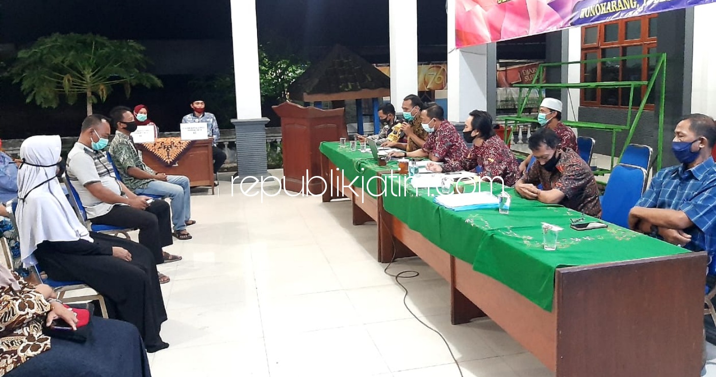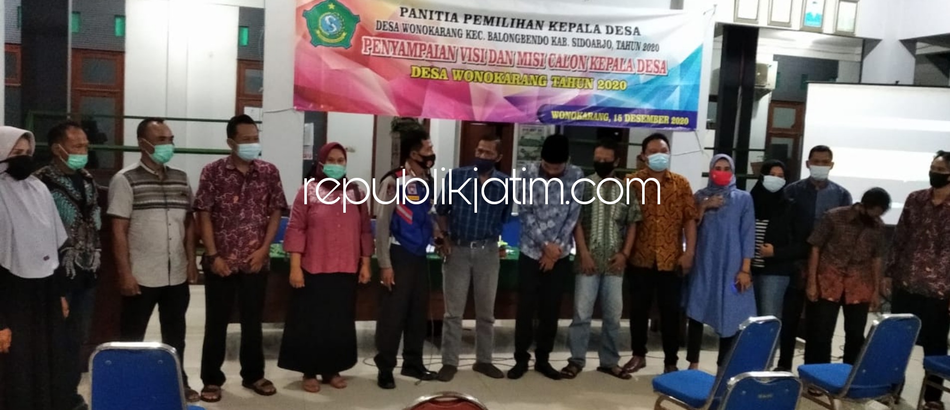 Sidoarjo (republikjatim.com) - Panitia Pemilihan Kepala Desa (Pilkades) Wonokarang, Kecamatan Balongbendo, Sidoarjo menggelar tahapan penyampaikan visi dan misi Calon Kepala Desa (Cakades) di Pendopo Balai Desa setempat, Selasa (15/12/2020) malam. Dua Cakades diberi waktu berkampanye soal program-programnya dalam membangun Desa Wonokarang. Bahkan visi dan misi yang akan disampaikan dua Cakades nantinya bisa dituangkan dalam APBDes saat menjabat menjadi Kepala Desa (Kades).