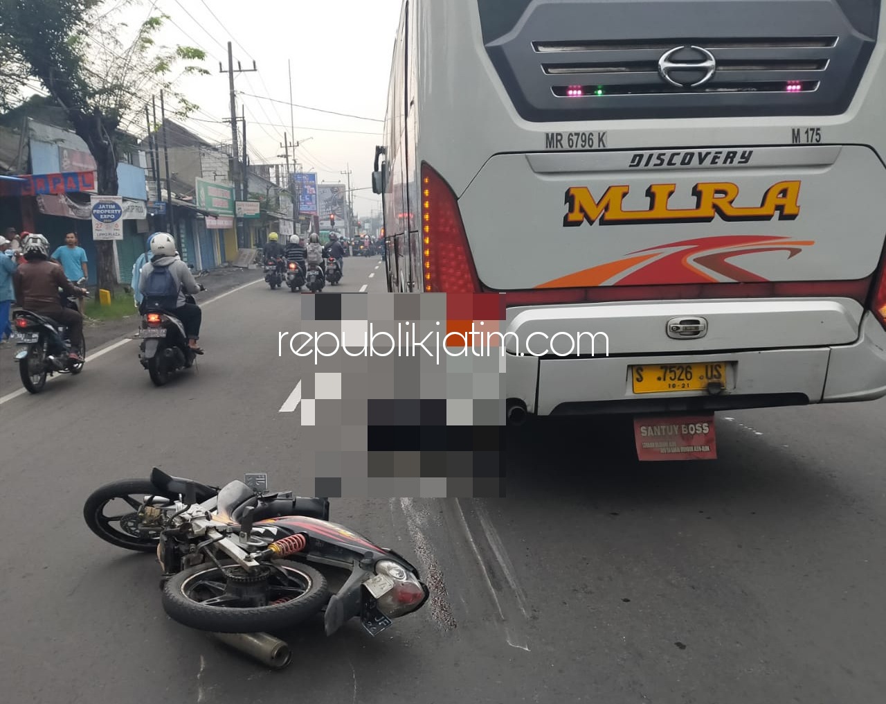 Kemudian korban terlindas roda belakang sebelah kiri bus PO Mira bernopol S 7526 US dikendarai Gunawan (58) warga Desa Keras Kulon, Kecamatan Geneng, Kabupaten Ngawi yang berjalan di lajur sebelah kanan arah sama. Yakni Mojokerto menuju Surabaya.