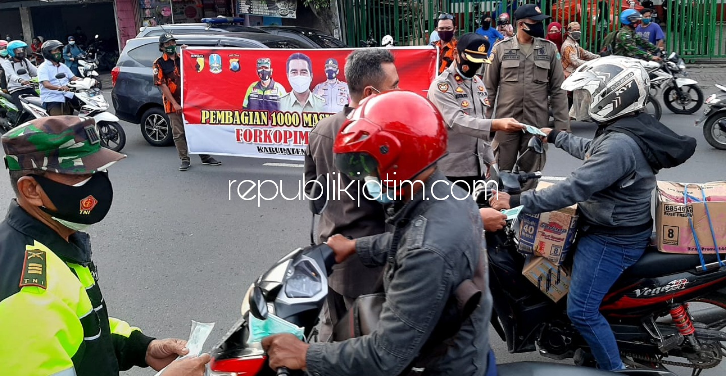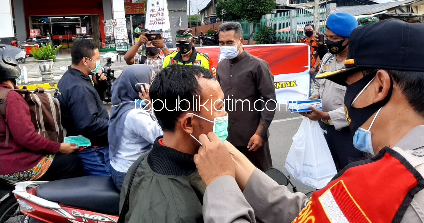 Sidoarjo (republikjatim.com) - Forkopimka Krian bersama sejumlah relawan dari beberapa komunitas di Krian membagikan 1.000 masker ke pengguna jalan di depan Pasar Krian, Senin (01/02/2021).