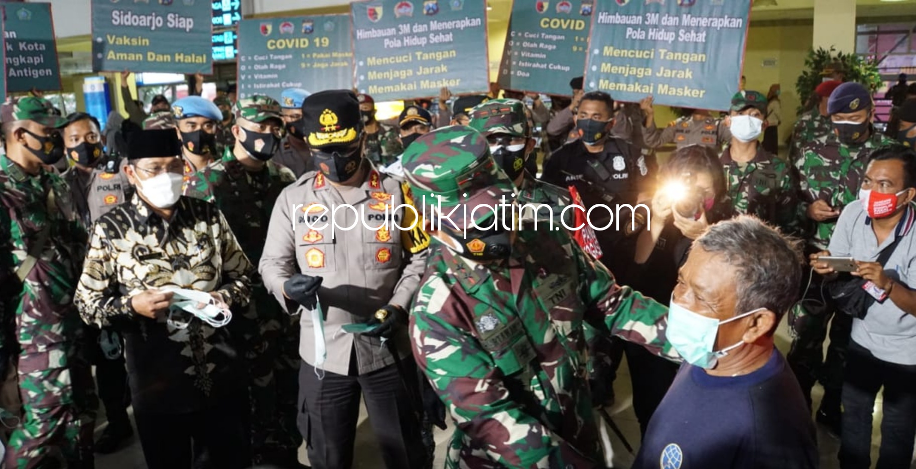 Sidoarjo (republikjatim.com) - Kapolda Jawa Timur Irjen Pol Nico Afinta, Pangdam V Brawijaya Mayjen TNI Suharyanto bersama jajaran Forkopimda Sidoarjo mengecek pelaksanaan Pemberlakuan Pembatasan Kegiatan Masyarakat (PPKM) jilid II di Terminal Bus Purabaya, Desa Bungurasih, Kecamata Waru, Sidoarjo, Kamis (04/02/2021) sore.