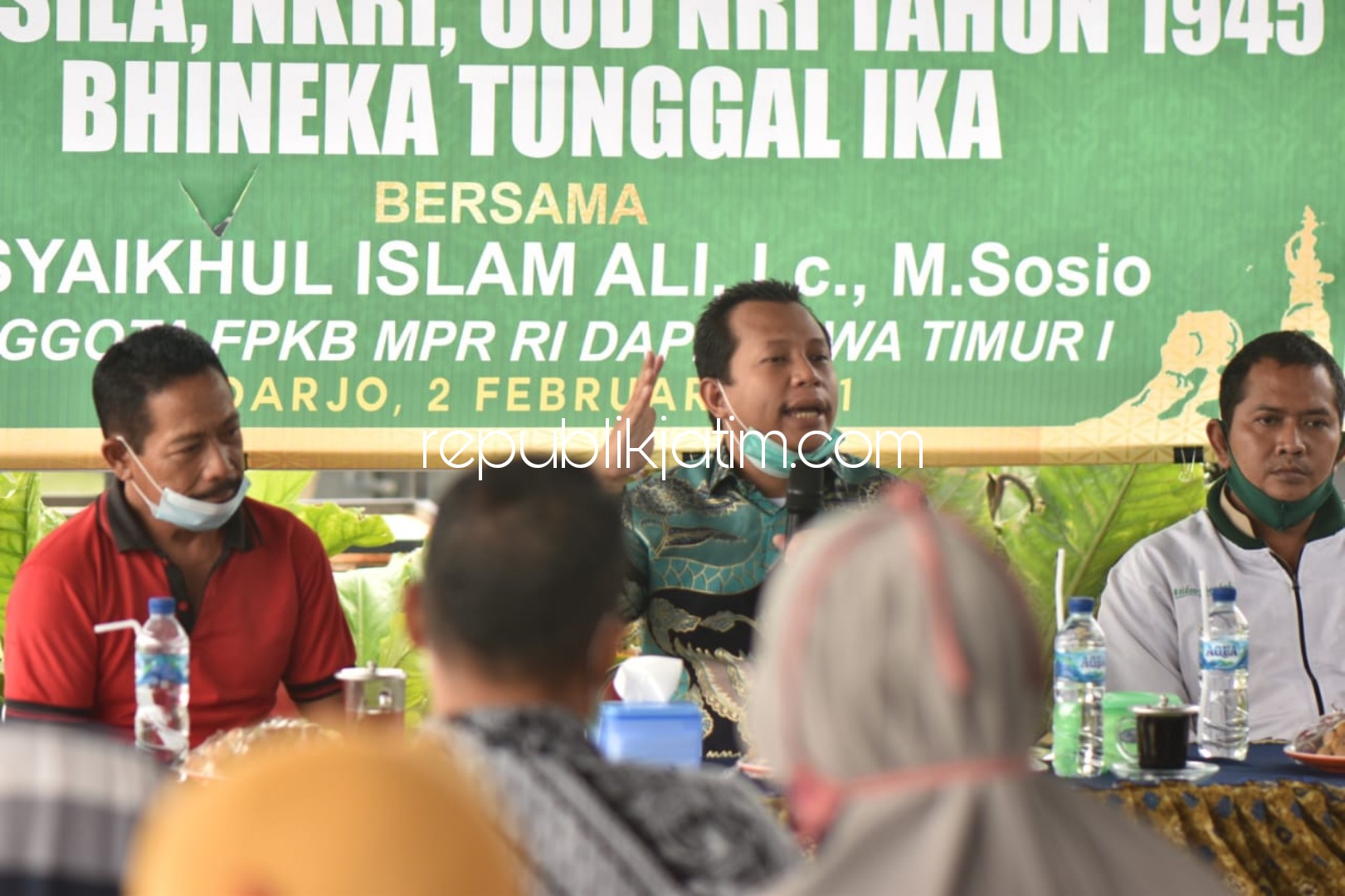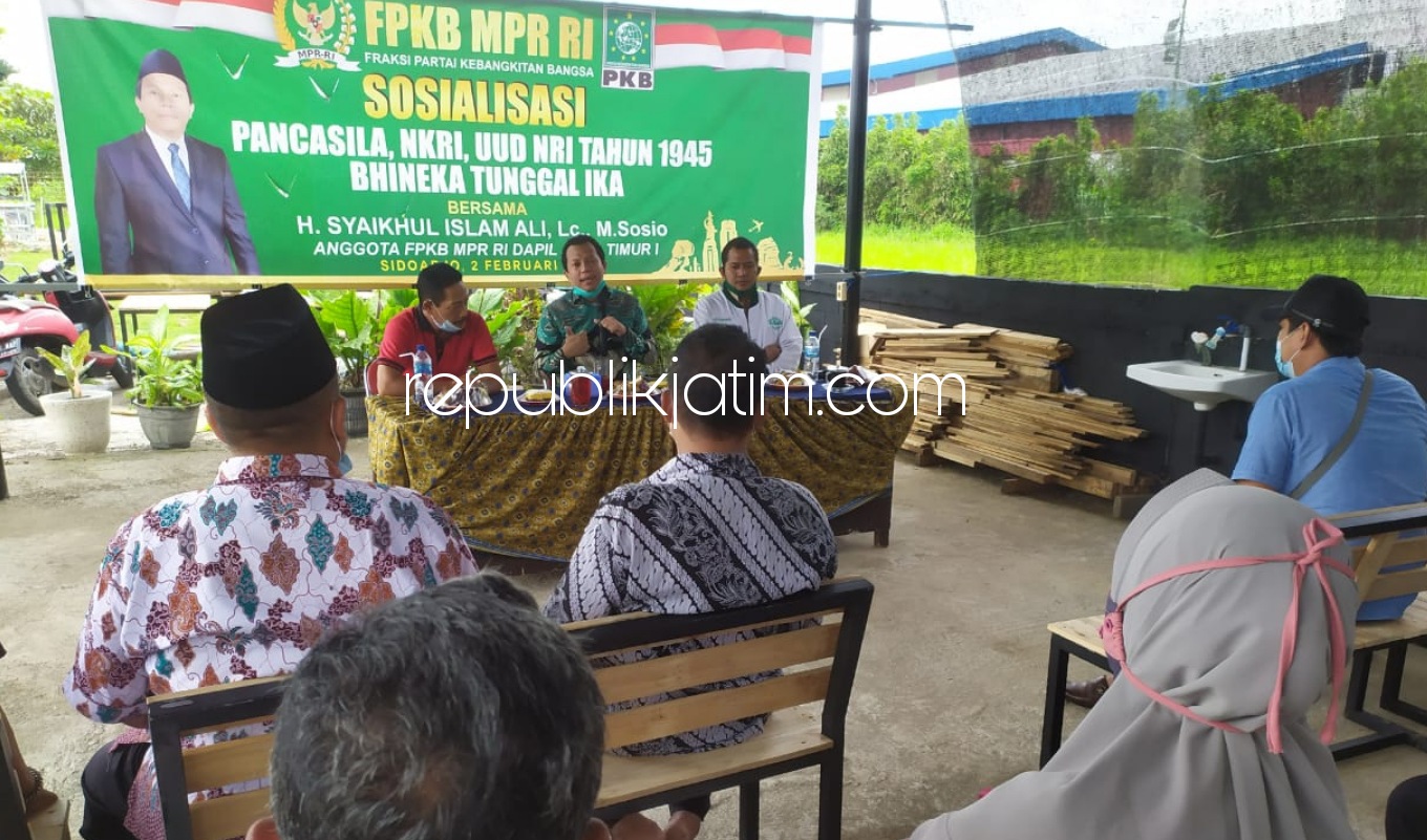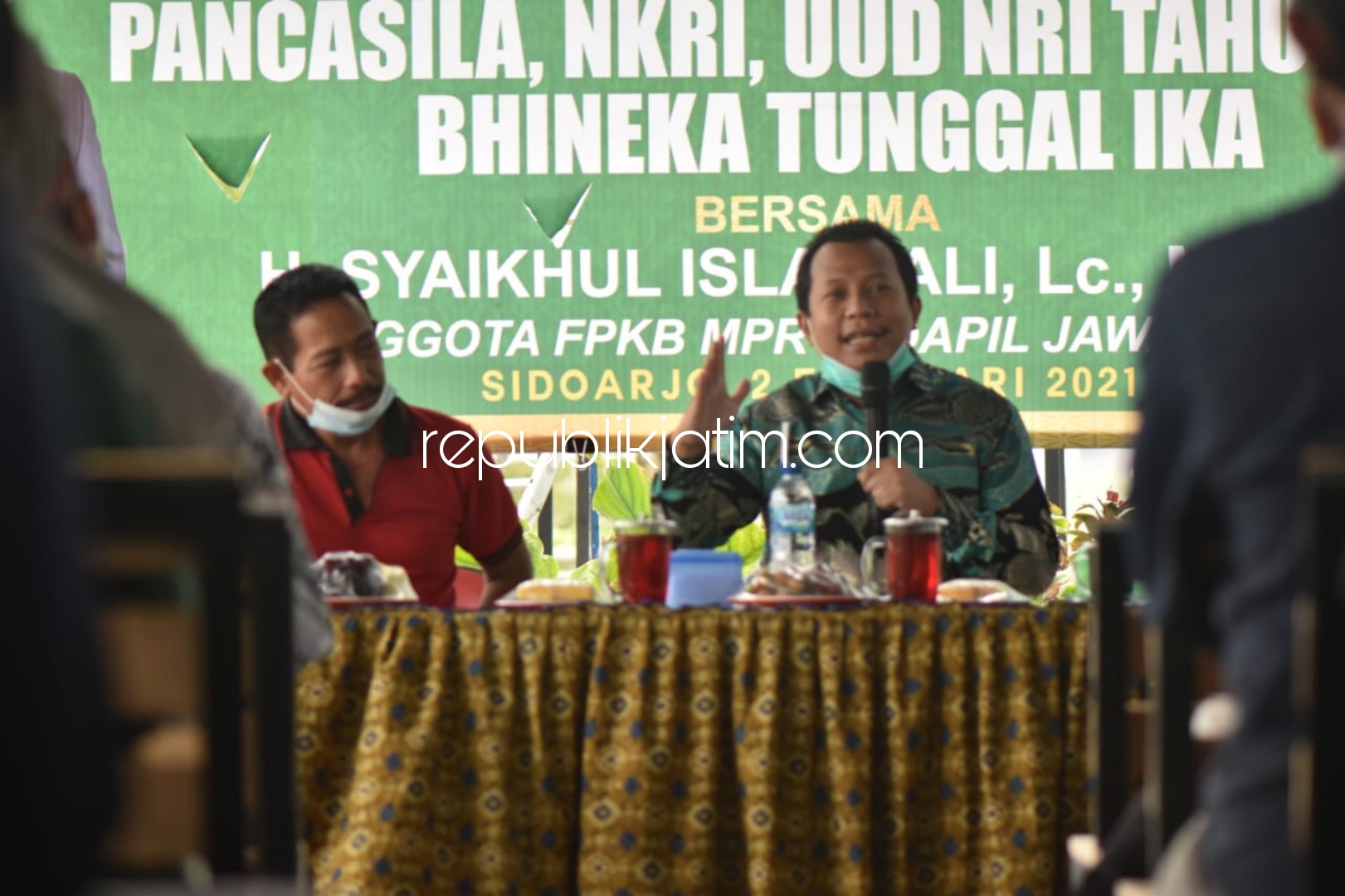 Sidoarjo (republikjatim.com) - Anggota Fraksi PKB DPR RI, Syaikhul Islam Ali melaksanakan kewajibannya sebagai anggota MPR RI. Pemuda yang akrab Gus Syaikhul ini mensosialisasikan 4 pilar kebangsaan untuk konstituennya. Dalam gelaran sosialisasi 4 pilar kebangsaan yang digelar di salah satu Kolam Pemancingan Ikan di Desa Ponokawan, Kecamatan Krian, Sidoarjo itu, sangat dinamis.