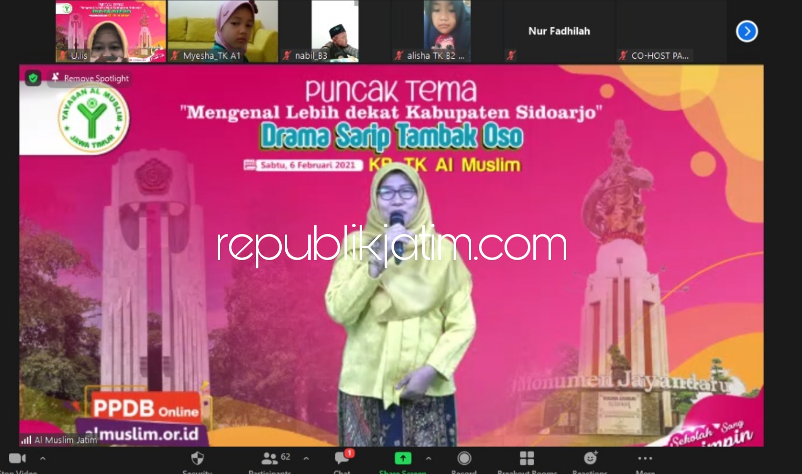 Sidoarjo (republikjatim.com) - Para guru dan pembina KB TK Al Muslim Sidoarjo menggelar pembelajaran bertepatan dengan peringatan Hari Jadi Kabupaten Sidoarjo ke 162. Kegiatan ini mengenalkan berbagai potensi Sidoarjo yang beridi sejak 31 Januari 1859 silam.