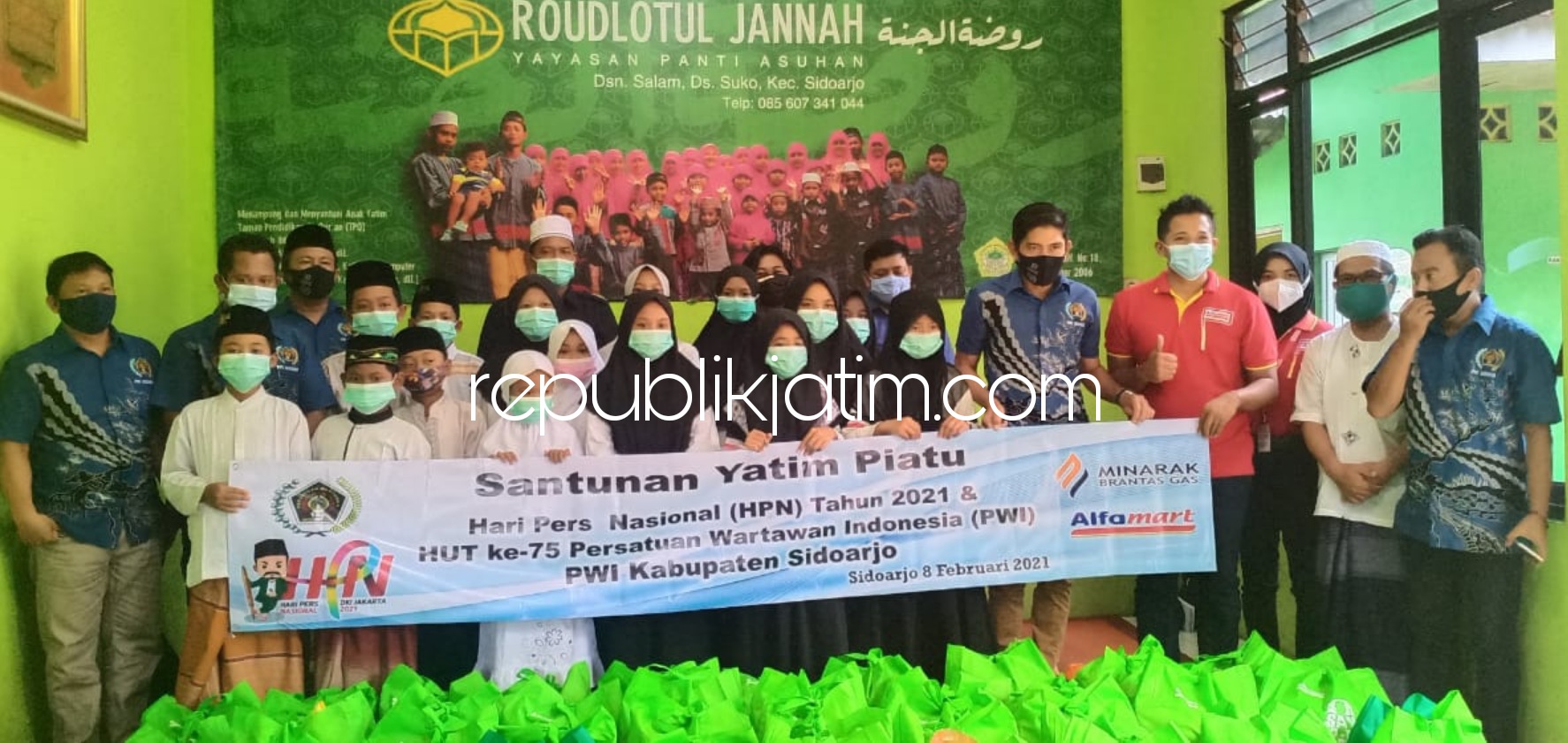 Sidoarjo (republikjatim.com) - Persatuan Wartawan Indonesia (PWI) Cabang Sidoarjo memperingati Hari Pers Nasional (HPN) Tahun 2021. Salah satunya, dengar menggelar pemberian santunan kepada puluhan anak Yatim Piatu dan Duafa di Panti Asuhan Roudlotul Jannah, Dusun Salam, Desa Suko, Kecamatan/Kabupaten Sidoarjo, Senin (08/02/2021).