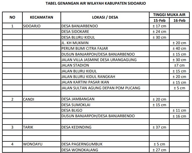 Sementara Kabid Irigasi dan Pematusan, Dinas Pekerjaan Umum, Bina Marga dan Sumber Daya Air (PU BMSDA) Pemkab Sidoarjo, Shanty Wahyu Anggraini menilai jika hujan merata dengan intensitas tinggi menjadi salah satu sebab utama banjir di sejumlah wilayah di Sidoarjo. Apalagi, hujan melanda Sidoarjo mulai Minggu sore merata hingga Rabu dini hari.