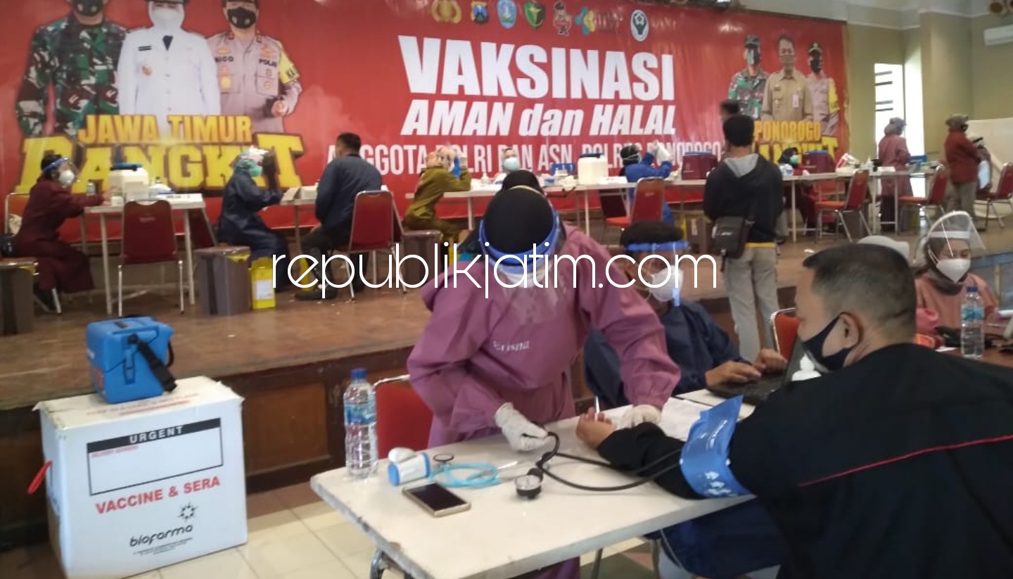 Ponorogo (republikjatim.com) - Di sela-sela persiapan kedatangan Bupati dan Wakil Bupati Ponorogo, Sugiri Sancoko dan Lisdyarita yang dilantik di Gedung Grahadi Surabaya, ratusan Polres Ponorogo divaksin untuk mencegah penyebaran (penularan) Covid-19, Jum'at (26/02/2021). Vaksinasi terhadap 925 anggota korp baju coklat ini digelar di Gedung Sasana Praja JL Diponegoro Ponorogo.