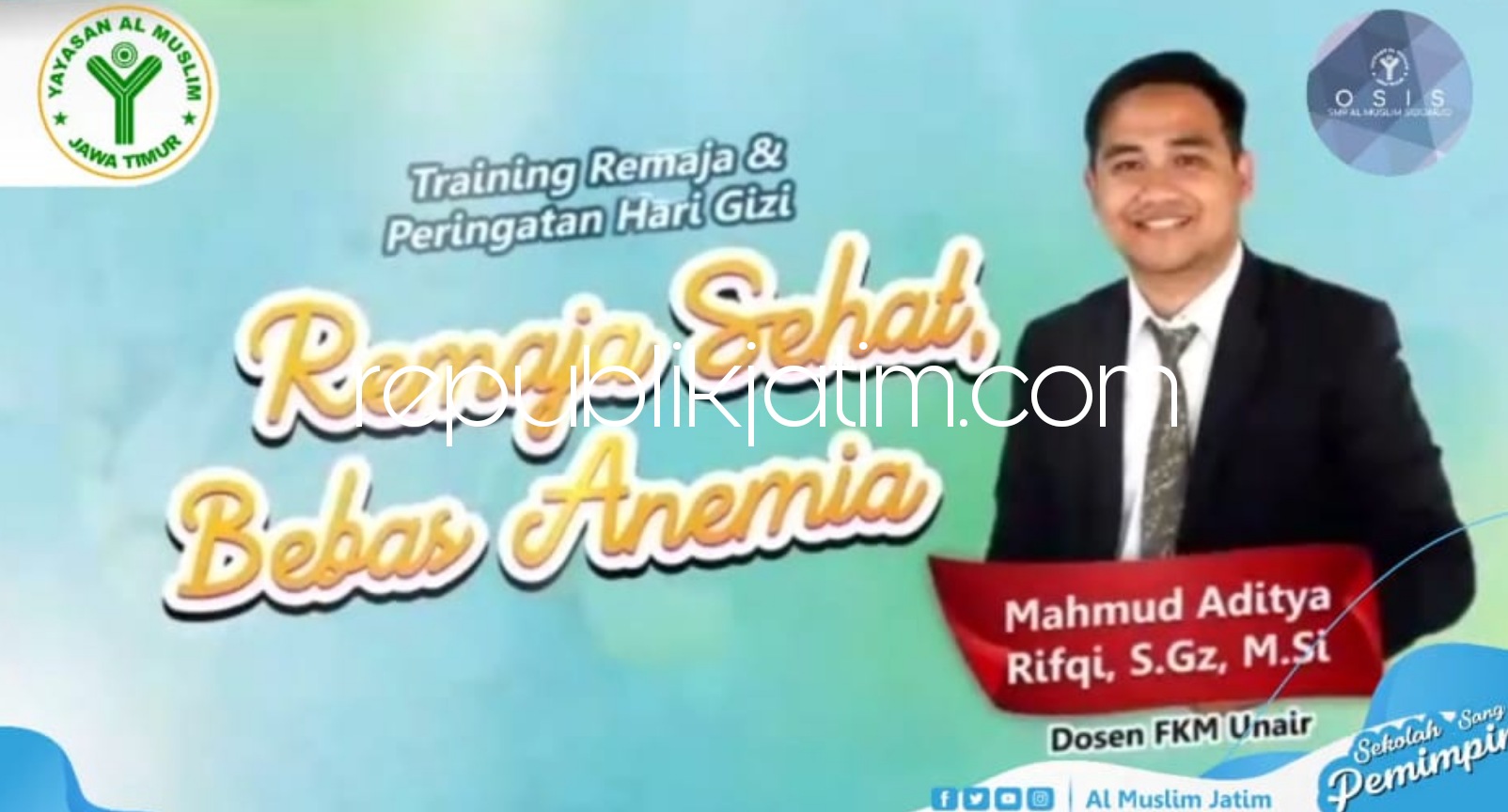 Webinar ini menjadi salah satu solusi untuk membekali siswa siswi mengatasi permasalahan gizi remaja agar terhindar dari penyakit anemia dan lainnya. Karenanya, narasumber berkompeten di bidang gizi dihadirkan yakni Dosen Fakultas Kesehatan Masyarakat (FKM) Unair Surabaya, Mahmud Aditya Rifqi S.Gz M.Si. Nara sumber ini, selain dosen juga Kepala Laboratorium Gizi Departemen Gizi Kesehatan FKM Unair.