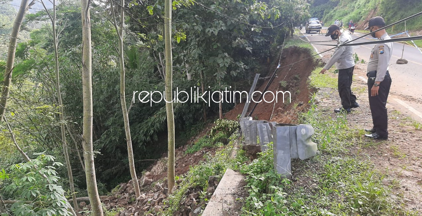 Ponorogo (republikjatim.com) - Peristiwa tanah longsor yang mengakibatkan bahu jalan utama Ponorogo - Trenggalek retak dan ambles. Bahkan jalan pasca adanya getaran gempa di Malang. Badan jalan nasional yang ambles dan retak itu, tepatnya di wilayah Dusun Blumbang, Desa Pangkal, Kecamatan Sawoo, Ponorogo.