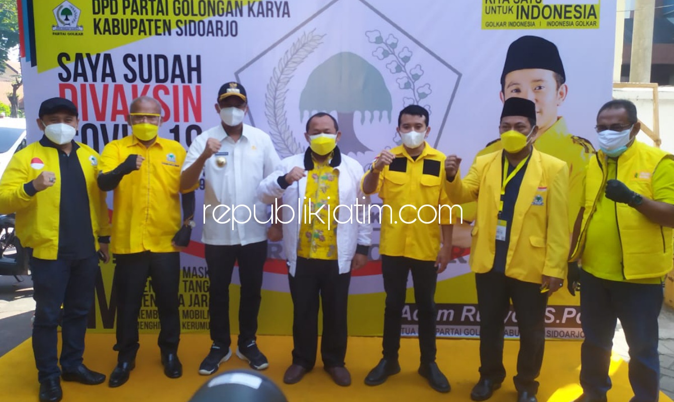 Sidoarjo (republikjatim.com) - Sedikitnya 500 kader Partai Golkar Sidoarjo menjalani vaksinasi massal di gedung DPD Golkar Sidoarjo, Rabu (28/07/2021). Ratusan kader yang ikut vaksinasi itu, mulai kader tingkat desa, kecamatan hingga para pengurus daerah yang belum mendapatkan jatah vaksinasi Covid-19 ini.