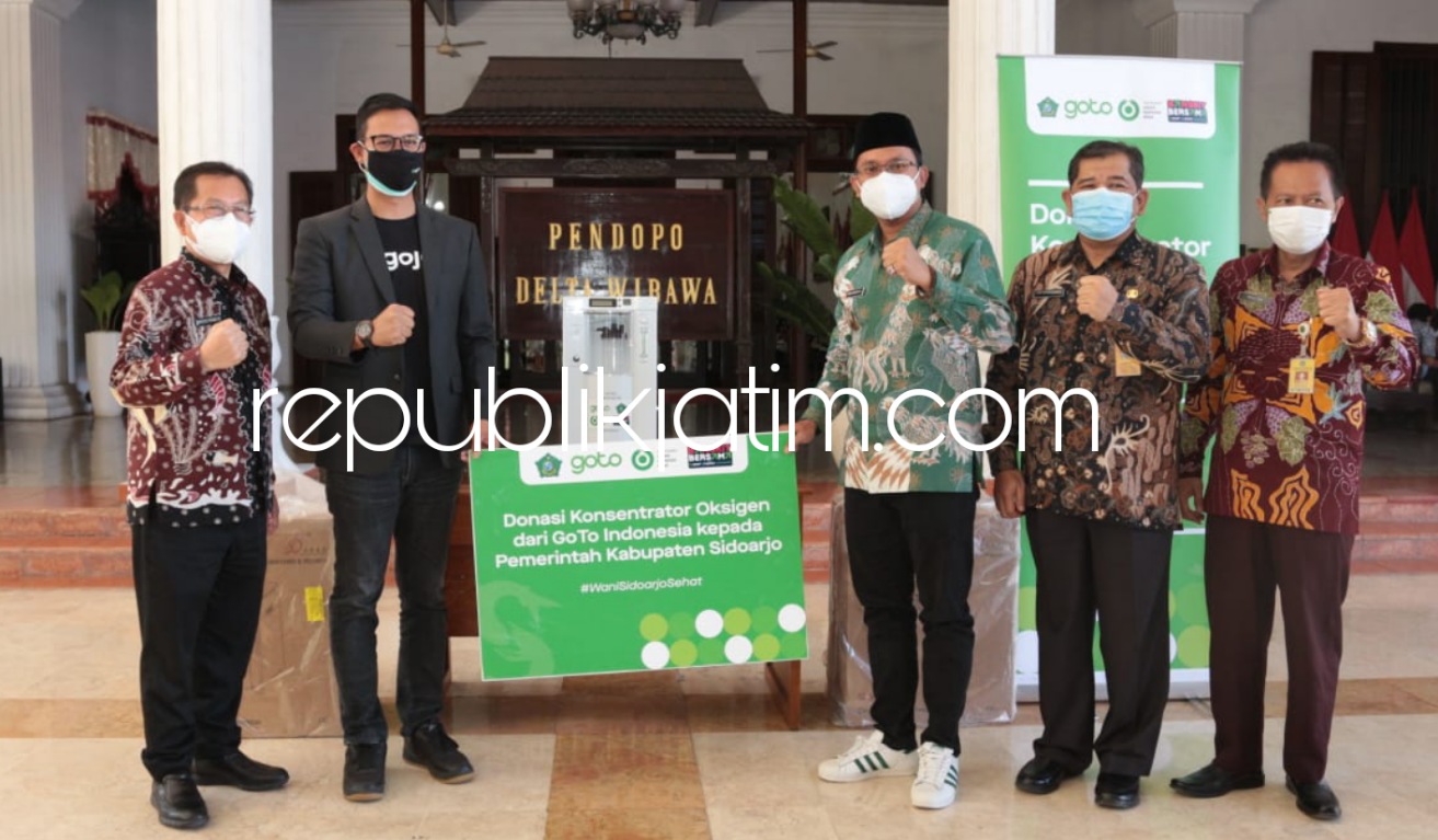Sidoarjo (republikjatim.com) - Sebanyak 10 mesin konsentrator oksigen bantuan dari GoTo Indonesia diterima Pemkab Sidoarjo. Bantuan dari dua perusahan gabungan Gojek dan Tokopedia (GoTo) ini diterima Bupati Sidoarjo, Ahmad Muhdlor Ali (Gus Muhdlor) dari Boy perwakilan Gojek di Pendopo Delta Wibawa, Kamis (26/08/2021).