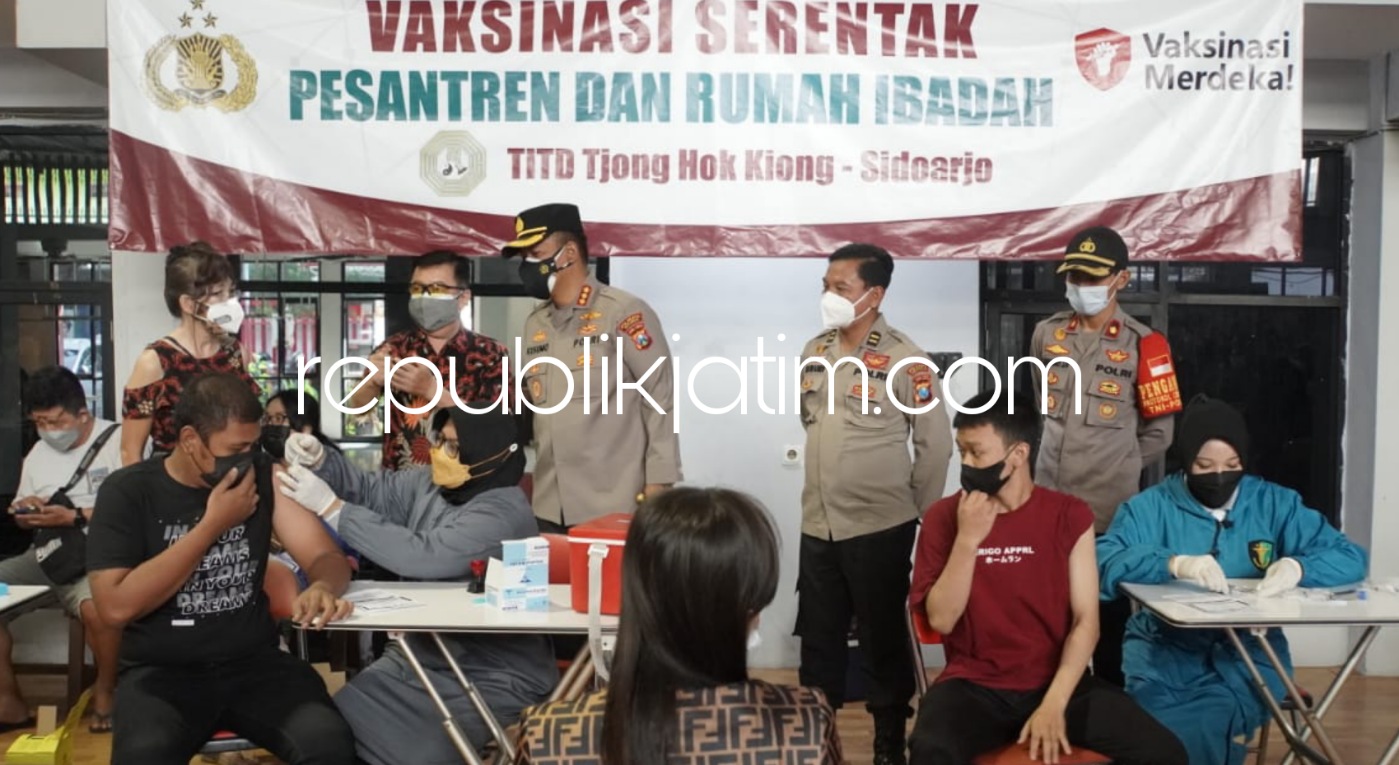 Kali ini, Polresta Sidoarjo bersama TNI dan pihak terkait terus melakukan percepatan vaksinasi serentak di pesantren dan rumah ibadah. Kegiatan Vaksinasi Merdeka serentak pesantren dan rumah ibadah, yang dipantau langsung Kapolresta Sidoarjo Kombes Pol Kusumo Wahyu Bintoro bersama pejabat utama Polresta Sidoarjo, jajaran Kodim 0816 Sidoarjo, puskesmas dan Forkopimka setempat berlangsung di Pondok Pesantren Roudlotul Muta’alimat III Al Machfudzoh, Kedungcagkring, Kecamatan Jabon, Sidoarjo. Selain itu juga vaksinasi diadakan di Klenteng TITD Tjong Hok Kiong, Sidoarjo.