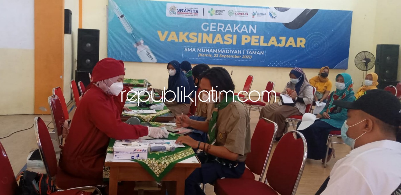 Sidoarjo (republikjatim.com) - SMA Muhammadiyah 1 Taman (Smamita) Sidoarjo sukses melaksanakan vaksinasi kepada seluruh siswa dan siswinya. Termasuk juga tenaga pengajar dan staf sekolah berlantai 8 itu.