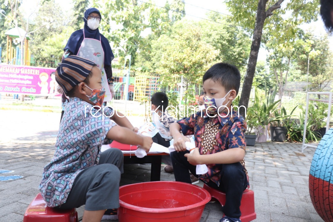 Sidoarjo (republikjatim.com) - Puluhan siswa dan siswi KBTK Al Muslim Sidoarjo, Jawa Timur membatik bersama-sama secara luring di sekolah dengan mematuhi protokol kesehatan dan daring melalui aplikasi zoom, Jumat (01/10/2021). Pembelajaran batik berbasis proyek ini digelar selama 5 hari berturut-turut.