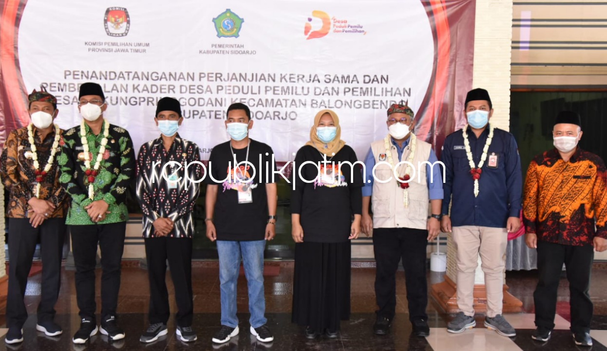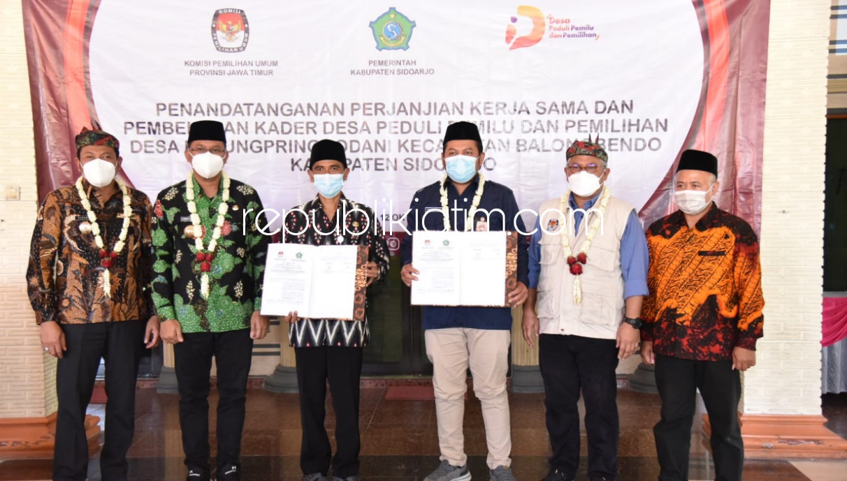 Sidoarjo (republikjatim.com) - Dalam rangka mendukung peningkatan kapasitas masyarakat Pemilu, Pemkab Sidoarjo bersinergi mendukung penuh program Desa Peduli Pemilu dan Pemilihan (DP3) yang digagas KPU RI. Dukungan itu ditandai penandatanganan MOU antara KPUD Jatim dan Desa Bakungpringgondani disaksikan Bupati Sidoarjo Ahmad Muhdlor Ali dan Komisioner KPU Pusat Arief Budiman di Kantor Balai Desa Bakungpringgondani, Kecamatan Balongbendo, Sidoarjo, Selasa (12/10/2021).