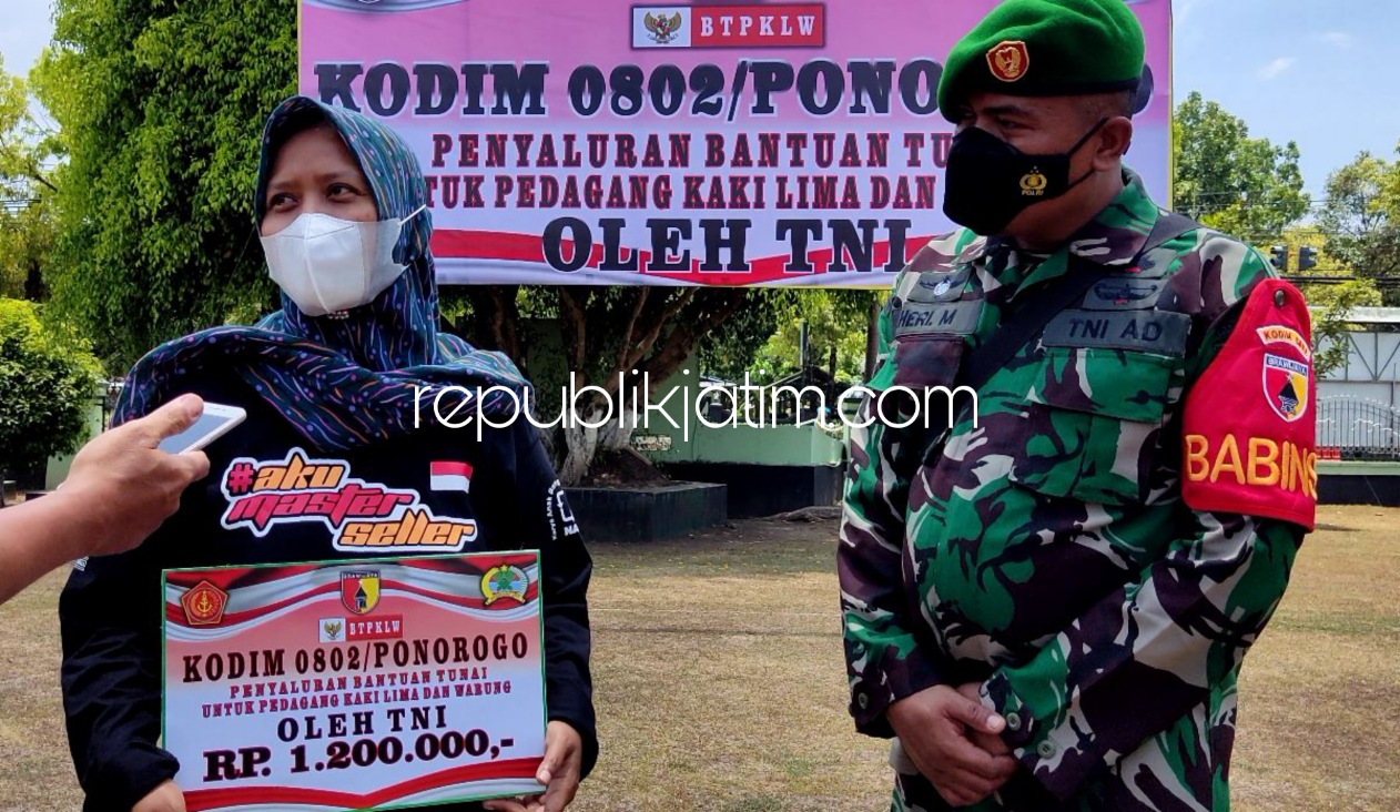 Komandan Kodim 0802 Ponorogo, Letkol Inf Muhammad Radhi Rusin mengatakan jika Bantuan Tunai untuk Pedagang Kaki Lima dan Warung (BTPKLW) melalui jalur TNI di Kodim 0802 Ponorogo untuk membantu warga, khususnya para pedagang kaki lima dan pemilik warung yang terdampak akibat pandemi Covid-19. Karena itu, bantuan tunai diserahkan dengan masing - masing mendapat Rp 1,2 juta.